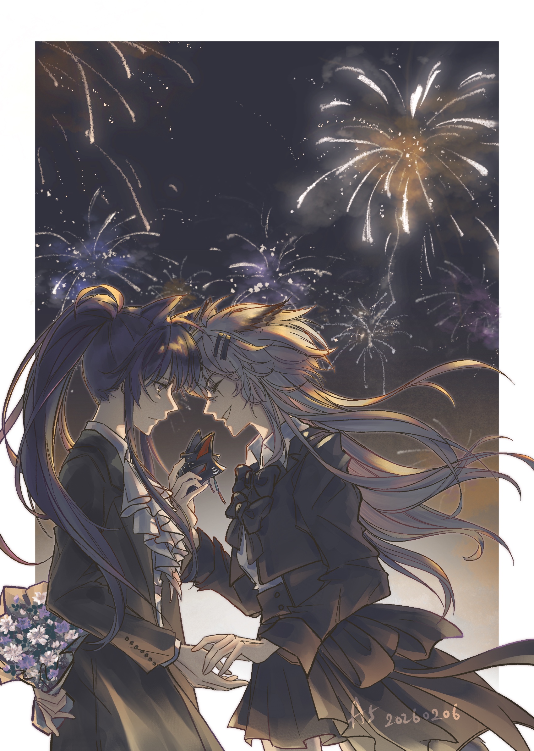 2girls a5wuni aerial_fireworks alternate_costume animal_ears arknights ascot backlighting black_jacket black_skirt bouquet chinese_commentary closed_eyes commentary_request dated face-to-face fireworks flower from_side grey_hair highres holding holding_bouquet holding_hands holding_mask jacket lappland_(arknights) long_hair long_sleeves looking_at_another mask multiple_girls night ponytail profile skirt sky smile texas_(arknights) white_ascot wolf_ears wolf_girl