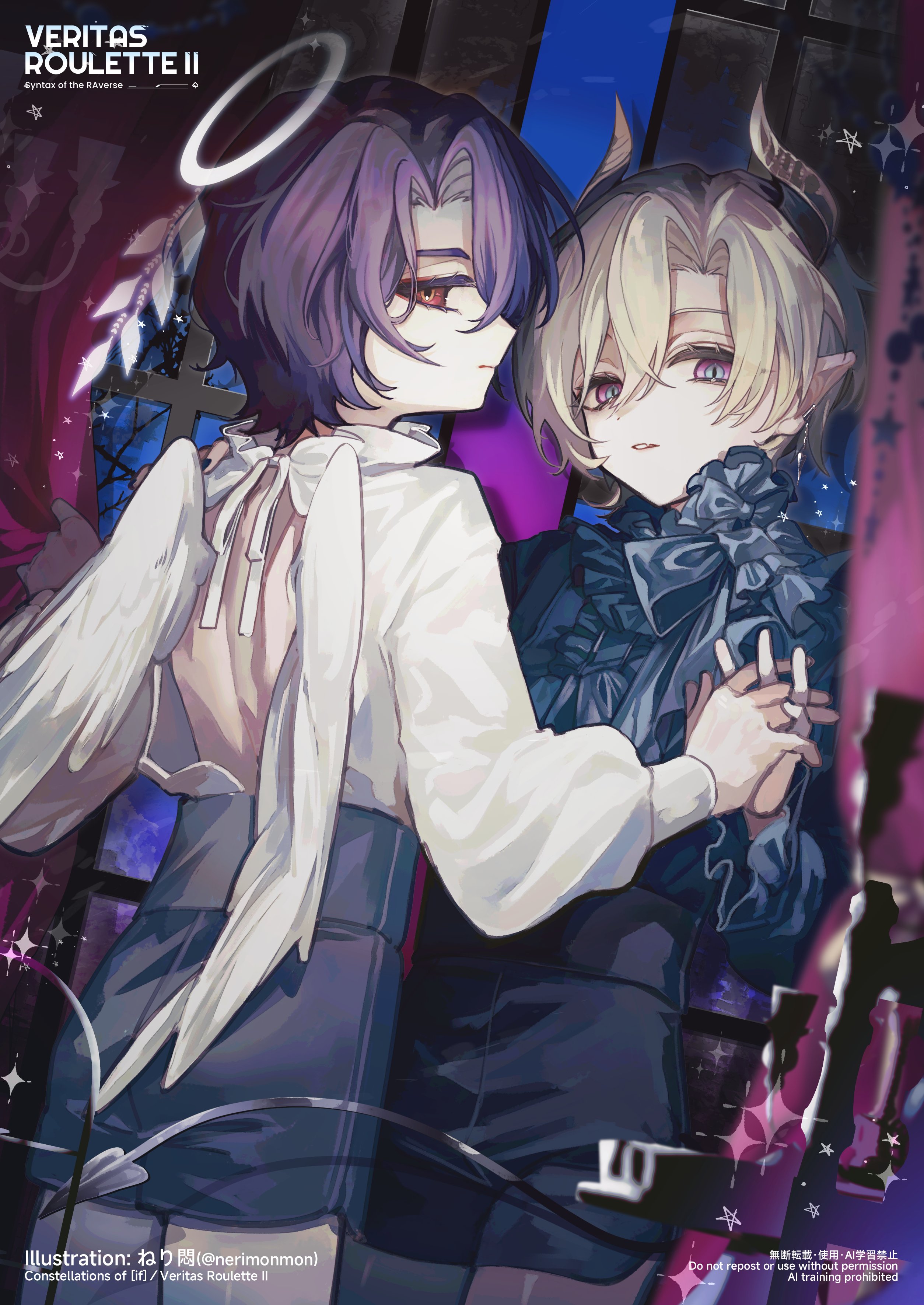 2boys absurdres alternate_costume angel_wings aventurine_(honkai:_star_rail) black_pants blonde_hair blue_eyes closed_mouth commentary_request dr._ratio_(honkai:_star_rail) feathered_wings frilled_shirt_collar frills hair_between_eyes hair_intakes halo highres holding_hands honkai:_star_rail honkai_(series) horns looking_at_viewer multicolored_eyes multiple_boys nerimono_(nekokoban22) pants parted_bangs puffy_sleeves purple_eyes purple_hair red_eyes shirt shorts teeth watermark white_halo white_shirt window wings