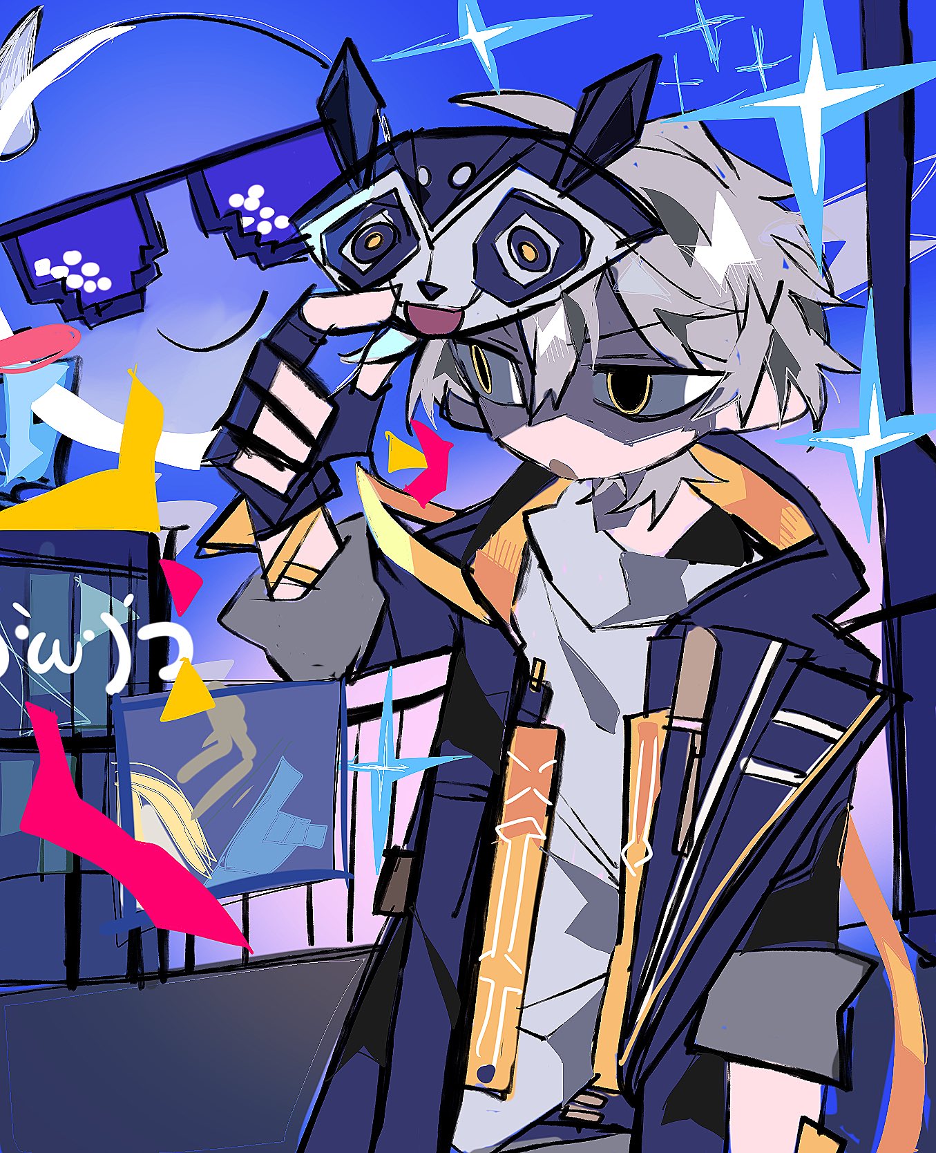 1boy black_gloves black_jacket caelus_(honkai:_star_rail) emoticon fingerless_gloves gloves grey_hair gugyuguba highres holding holding_mask honkai:_star_rail honkai_(series) jacket kaomoji male_focus mask open_mouth purple-framed_eyewear raccoon_mask shirt short_hair smile solo sparkle_background trailblazer_(honkai:_star_rail) white_shirt yellow_eyes