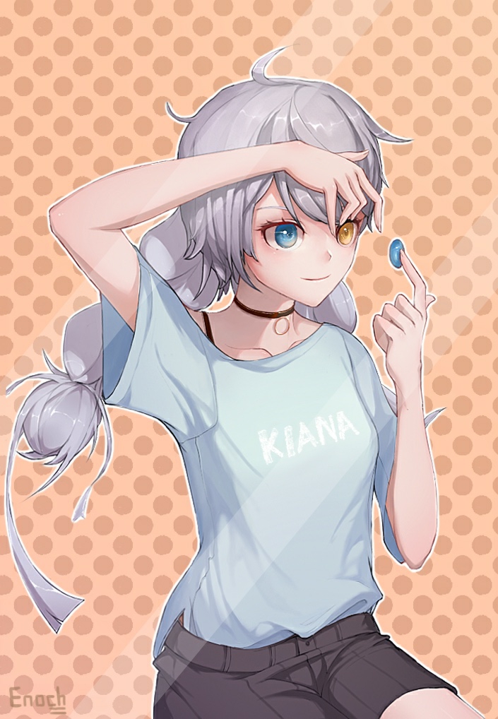 1girl ahoge artist_name bad_id bad_pixiv_id black_choker black_shorts blue_eyes blue_shirt braid character_name choker closed_mouth contact_lens enoch_(enoch1368) heterochromia honkai_(series) honkai_impact_3rd kiana_kaslana long_hair orange_background polka_dot polka_dot_background putting_in_contact_lens shirt shorts smile solo twin_braids white_hair