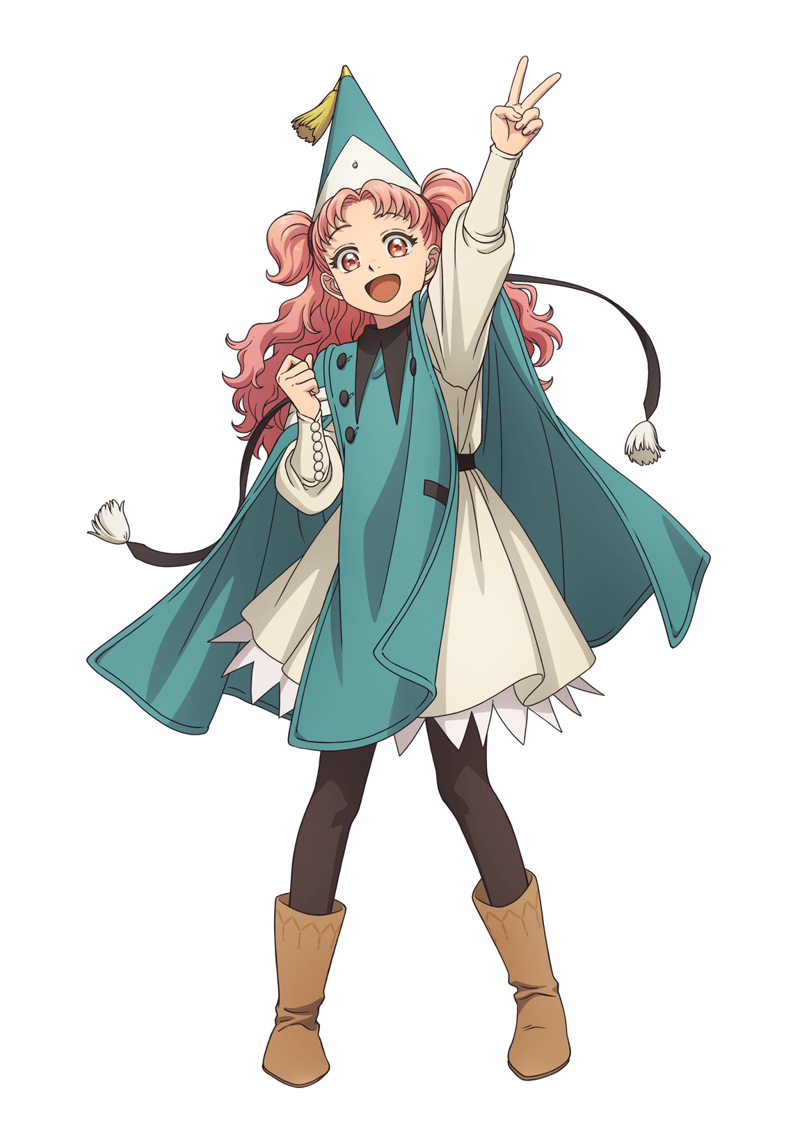 1girl arm_up artist_request black_pantyhose boots fluffy_hair full_body hat hat_tassel highres long_hair long_sleeves looking_at_viewer official_art open_mouth pantyhose pink_eyes pink_hair qifrey's_atelier_apprentice_uniform solo standing tetia_(tongari_boushi_no_atelier) tongari_boushi_no_atelier transparent_background v