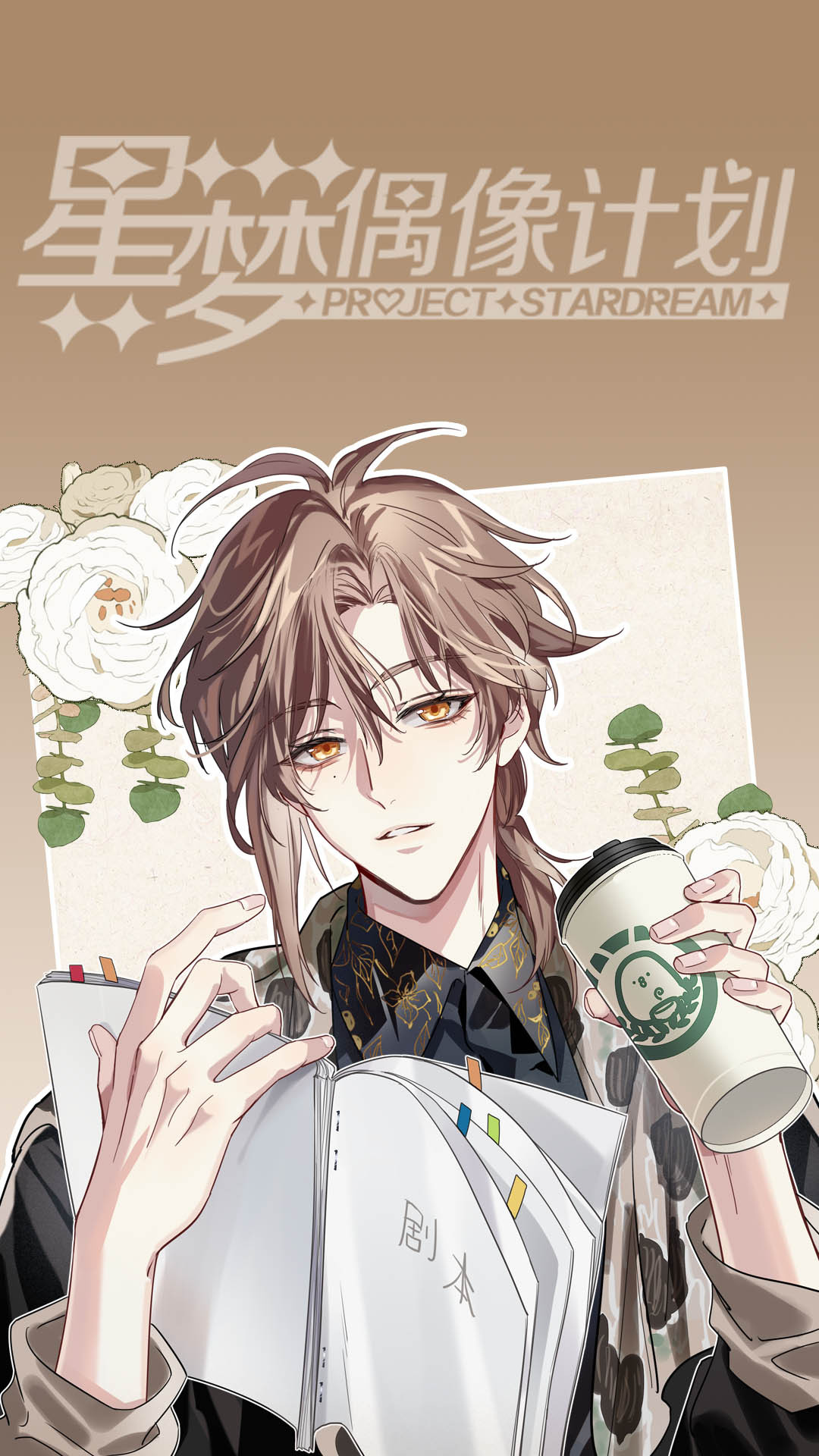 1boy bai_xiao_(xingmeng_ouxiang_jihua) black_shirt book brown_background brown_hair chinese_commentary collared_shirt commentary_request copyright_name cup disposable_coffee_cup disposable_cup flower highres holding holding_book holding_cup logo male_focus official_art open_book orange_eyes parted_lips shirt short_hair solo upper_body white_flower xingmeng_ouxiang_jihua yantou_hstone