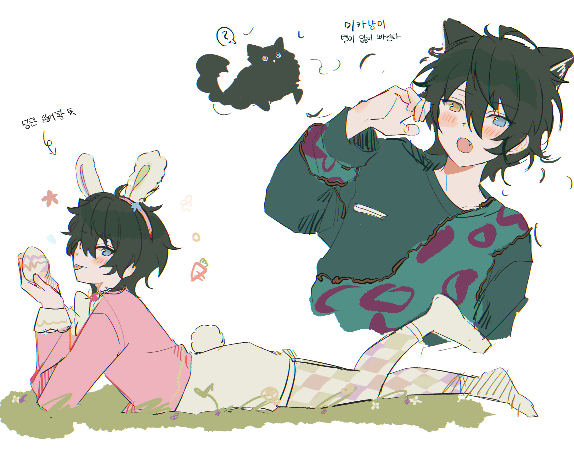 1boy ahoge animal_ear_hairband animal_ears argyle_clothes argyle_pantyhose arm_support art_12love blue_eyes blush cat cat_boy cat_ears commentary_request costume_request easter_egg egg ensemble_stars! fake_animal_ears fang green_hair green_sweater hair_between_eyes hairband hand_up heterochromia highres holding holding_egg kagehira_mika kemonomimi_mode korean_commentary korean_text looking_at_viewer lying male_focus multiple_views on_stomach open_mouth pantyhose paw_pose pink_shirt rabbit_ear_hairband rabbit_ears rabbit_tail shirt short_hair shorts simple_background solo sweater tail tongue tongue_out upper_body white_background white_shorts yellow_eyes