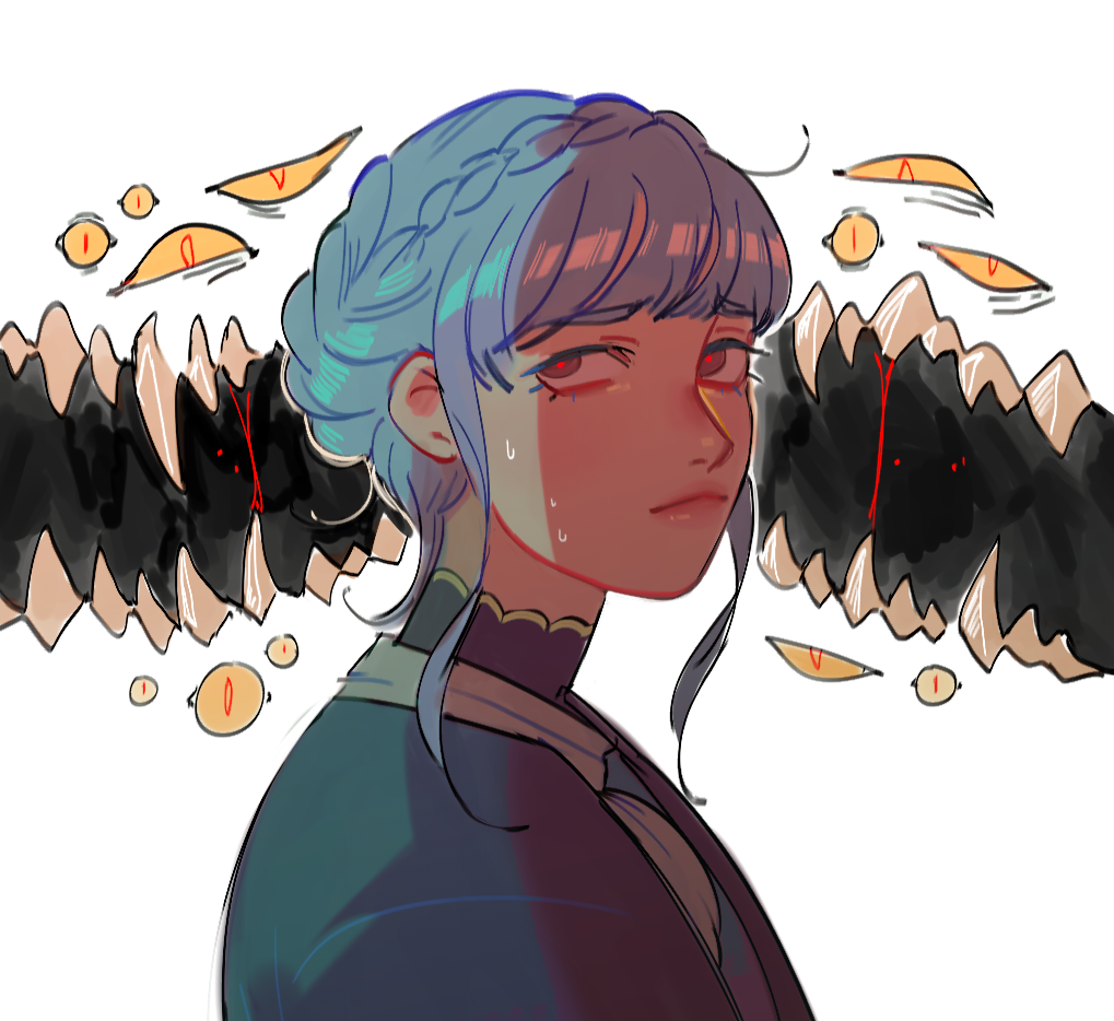 1girl blue_hair blunt_bangs braid crown_braid fire_emblem fire_emblem:_three_houses frida_(str8boykev) marianne_von_edmund nintendo portrait red_pupils sharp_teeth short_hair sidelocks solo teeth white_background
