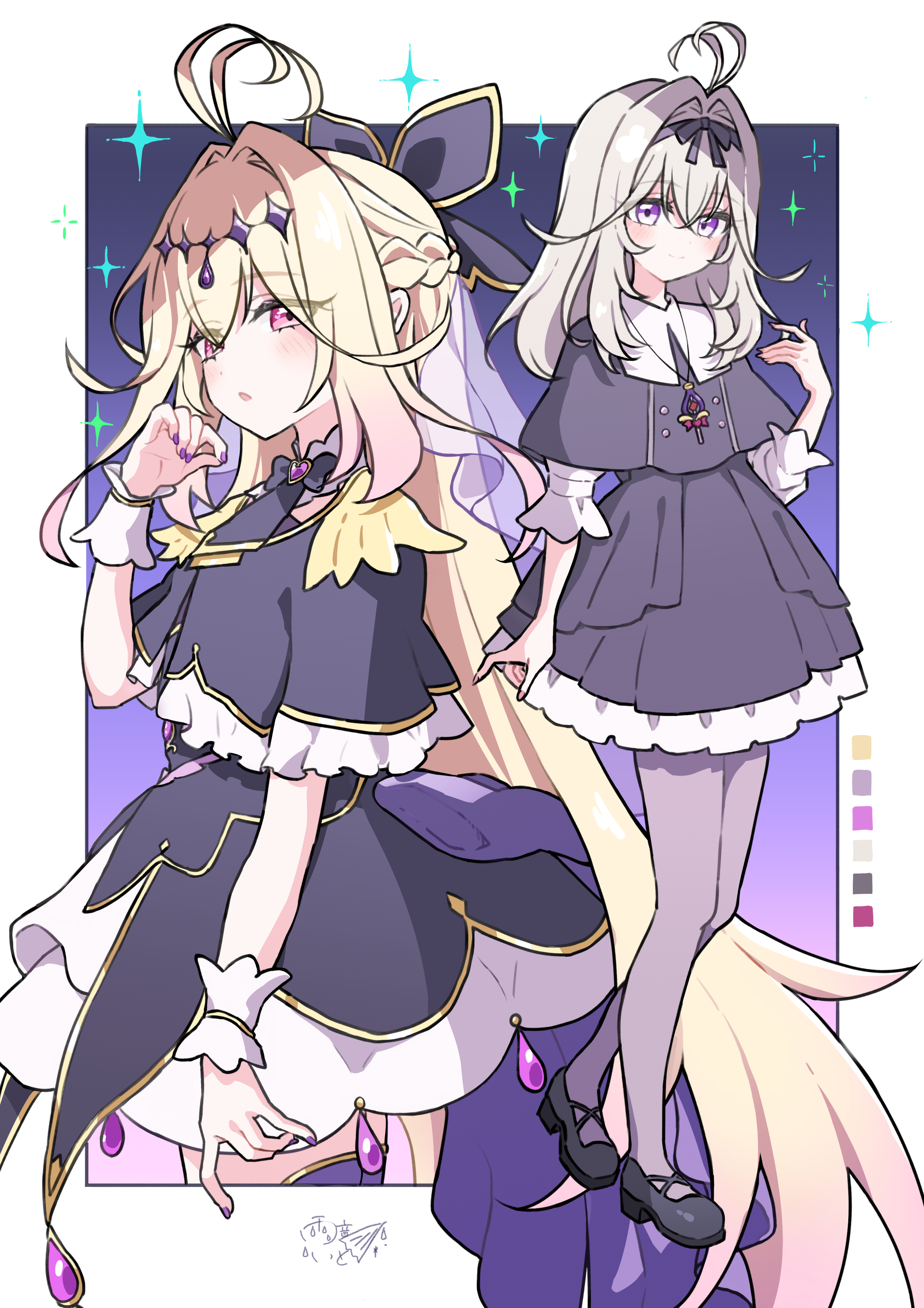 1girl absurdres amane_ito antenna_hair artist_name black_bow black_capelet black_dress black_ribbon black_shoes blonde_hair bow braid brooch capelet closed_mouth color_guide crown_braid cure_arcana_shadow diamond_hairband dress frilled_capelet frilled_cuffs frilled_dress frills from_side frown gradient_hair grey_hair grey_pantyhose hair_bow hair_intakes hair_ribbon half-closed_eyes heart heart_brooch highres jewelry layered_dress long_hair long_sleeves looking_at_viewer magical_girl mary_janes meitantei_precure! moria_luluka multicolored_hair multipl necklace open_mouth outside_border pantyhose precure purple_eyes purple_veil ribbon shirt shoes short_dress signature smile sparkle standing veil white_shirt