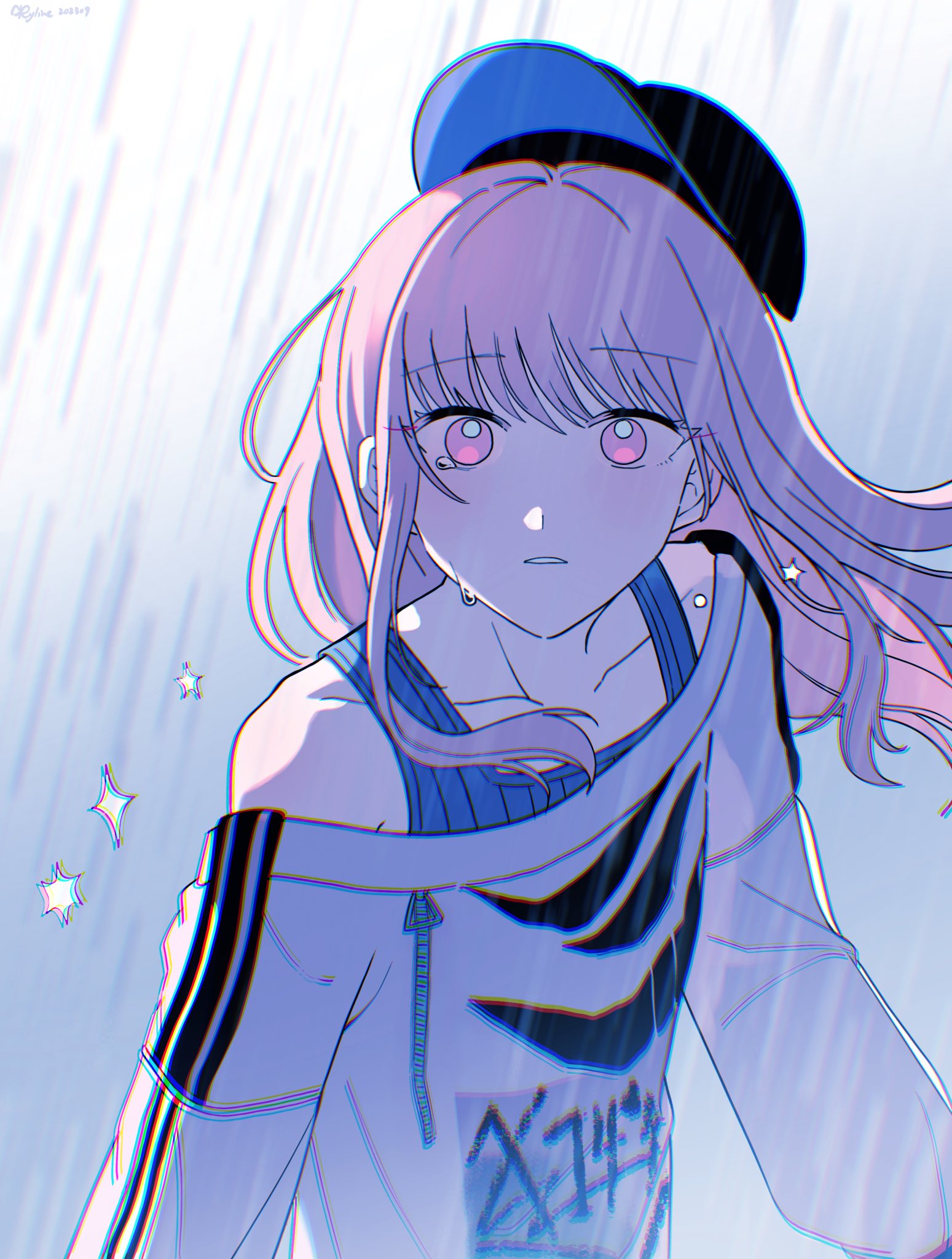 1other akiyama_mizuki androgynous artist_name baseball_cap black_hat chinese_commentary clenched_teeth commentary_request dated hair_down hat highres kyline long_hair long_sleeves looking_at_viewer official_alternate_costume official_alternate_hairstyle parted_lips pink_eyes pink_hair project_sekai rain tears teeth upper_body