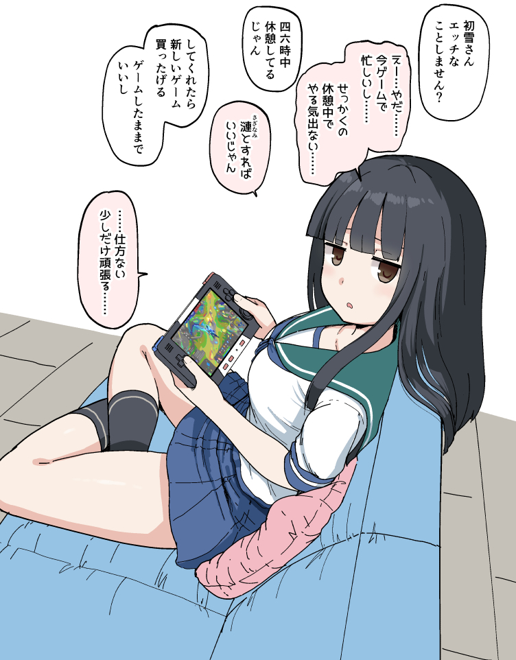 1girl alternate_breast_size_(larger) black_eyes black_hair black_socks blue_sailor_collar blue_skirt blunt_bangs breasts commentary_request hatsuyuki_(kancolle) hime_cut kantai_collection large_breasts looking_at_viewer mimofu_(fullhighkick) miniskirt pleated_skirt sailor_collar school_uniform serafuku short_sleeves sitting skirt socks solo speech_bubble translation_request