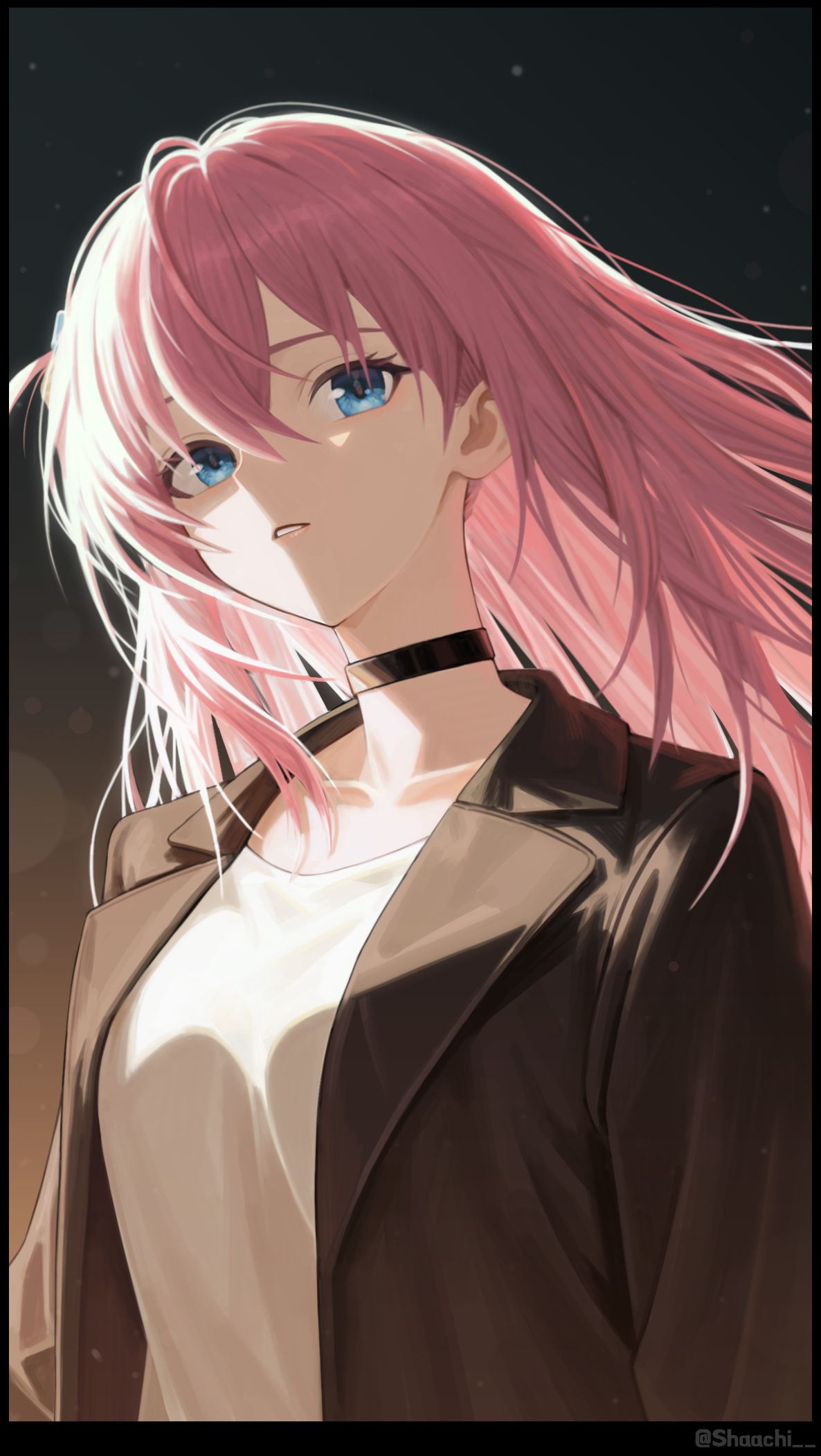 1girl blue_eyes bocchi_the_rock! breasts collarbone gotoh_hitori highres jacket long_hair medium_breasts pink_hair shaachi shirt solo upper_body white_shirt