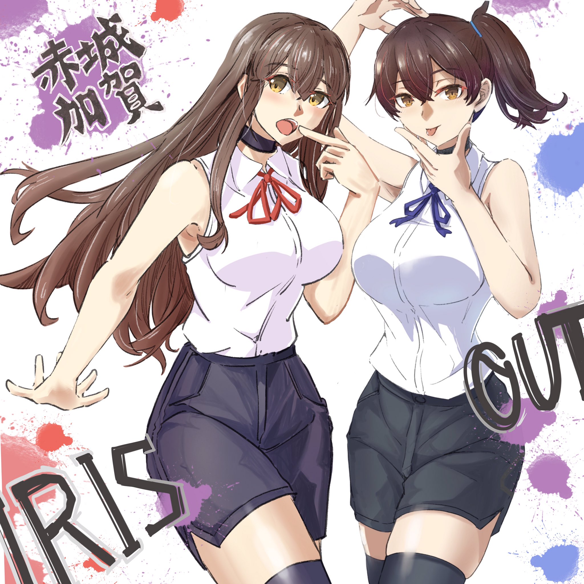 2girls akagi_(kancolle) black_shorts black_thighhighs breasts brown_eyes brown_hair chainsaw_man collared_shirt commentary copyright_name cosplay dress_shirt highres iris_out_(song) kaga_(kancolle) kantai_collection large_breasts long_hair multiple_girls reze_(chainsaw_man) reze_(chainsaw_man)_(cosplay) reze_dance shirt shorts side_ponytail sleeveless sleeveless_shirt thighhighs tongue tongue_out tonke underwear white_shirt