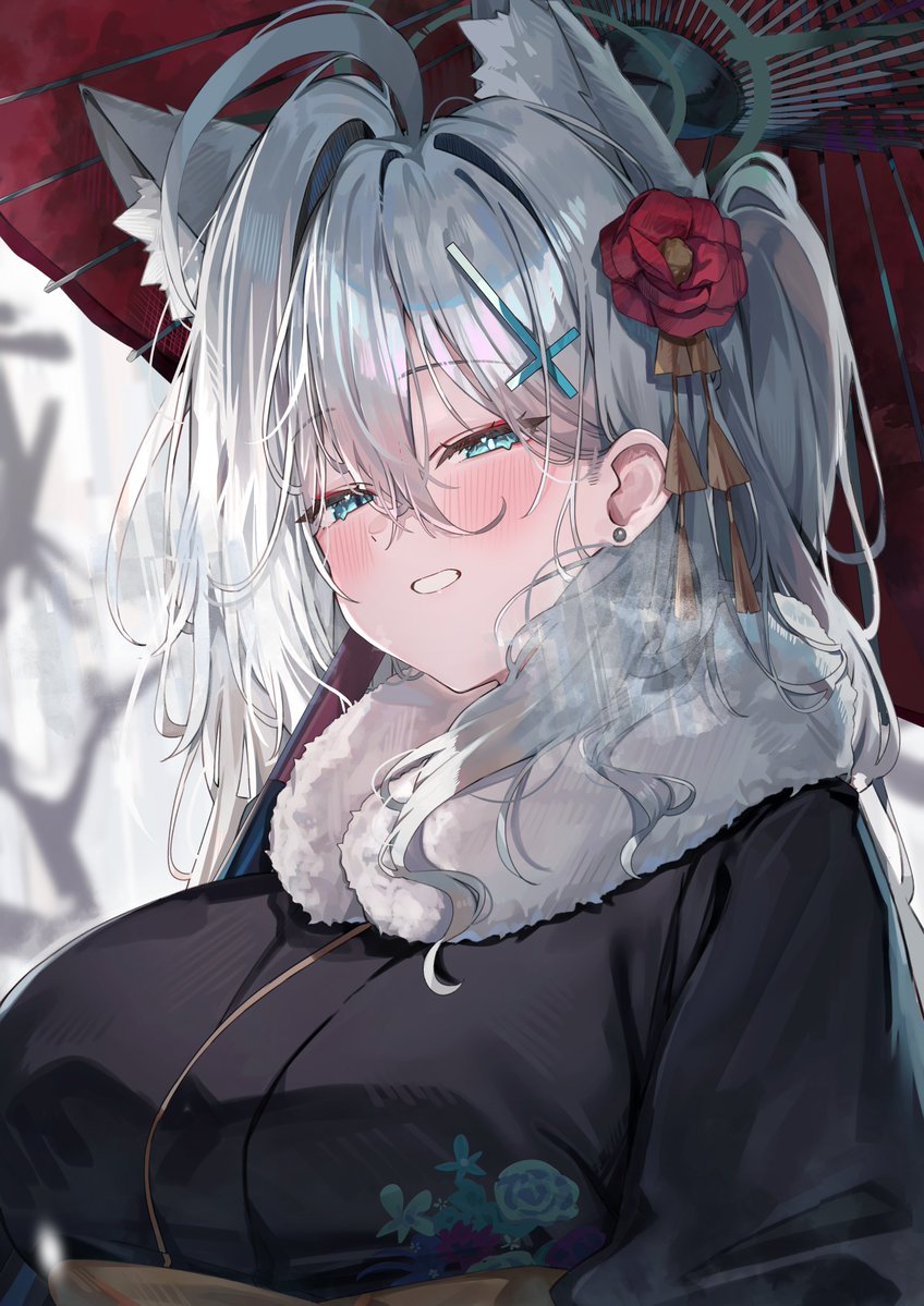 1girl ahoge alternate_costume animal_ear_fluff animal_ears bare_tree black_halo black_kimono blue_archive blue_eyes blush breasts commentary_request cross_hair_ornament earrings fur-trimmed_kimono fur_trim grey_hair grin hair_between_eyes hair_ornament halo holding holding_umbrella japanese_clothes jewelry kanzashi kimono kuroshiro_kanae large_breasts long_hair looking_at_viewer oil-paper_umbrella one_side_up outdoors red_umbrella shiroko_terror_(blue_archive) smile snowing solo tree umbrella upper_body wolf_ears wolf_girl