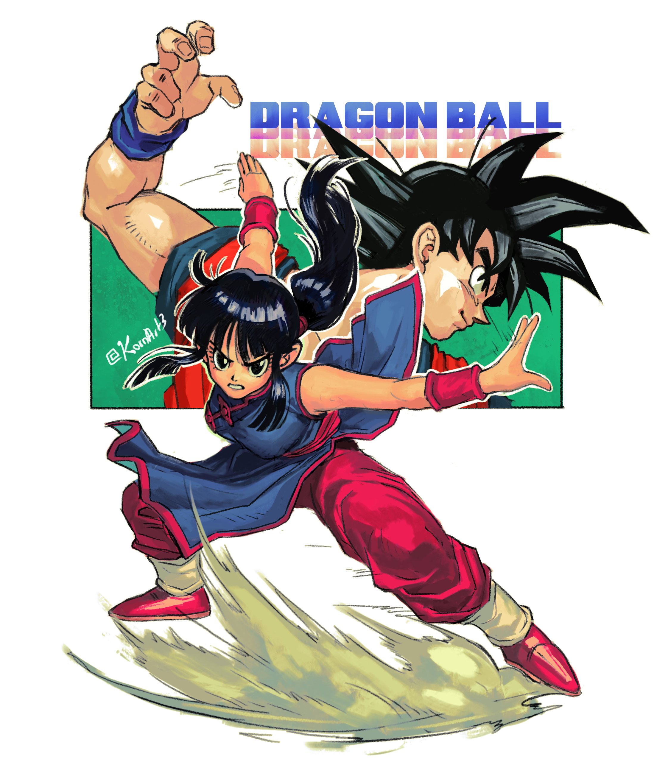 1boy 1girl absurdres black_eyes black_hair breasts chi-chi_(dragon_ball) china_dress chinese_clothes copyright_name dragon_ball dragon_ball_(classic) dress fighting_stance full_body highres kornart long_hair pants ponytail red_pants solo_focus son_goku