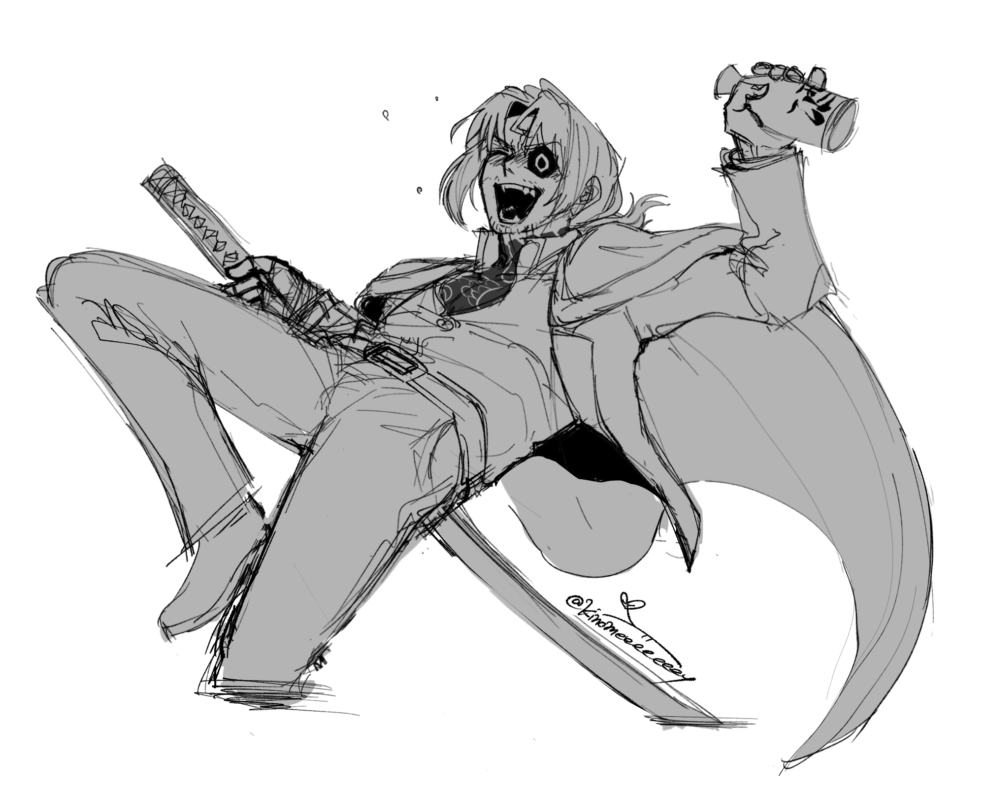 1boy absurdres alcohol alternate_costume amputee arm_up artist_name bandaged_arm bandages beard_stubble belt belt_buckle blush bottle buckle chest_tattoo coat coat_on_shoulders collared_shirt cropped_legs dress_shirt drink drunk eyepatch facial_hair fangs fingernails formal_clothes full-body_tattoo gregor_(project_moon) greyscale hair_intakes highres holding holding_bottle holding_sword holding_weapon joints katana kurokumo_clan_(identity)_(project_moon) lapels leaning_back leg_up limbus_company long_hair long_sleeves low_ponytail male_focus mechanical_arms monochrome neck_tattoo notched_lapels one-eyed one_eye_closed open_clothes open_coat open_mouth open_vest pants parted_bangs partially_unbuttoned ponytail project_moon prosthesis prosthetic_arm sake sake_bottle sharp_teeth shirt shirt_tucked_in shoes signature simple_background single_mechanical_arm sketch smile solo spilling stubble suit sword tattoo tattoo_on_neck teeth twitter_username unsheathed vest weapon white_background wing_collar