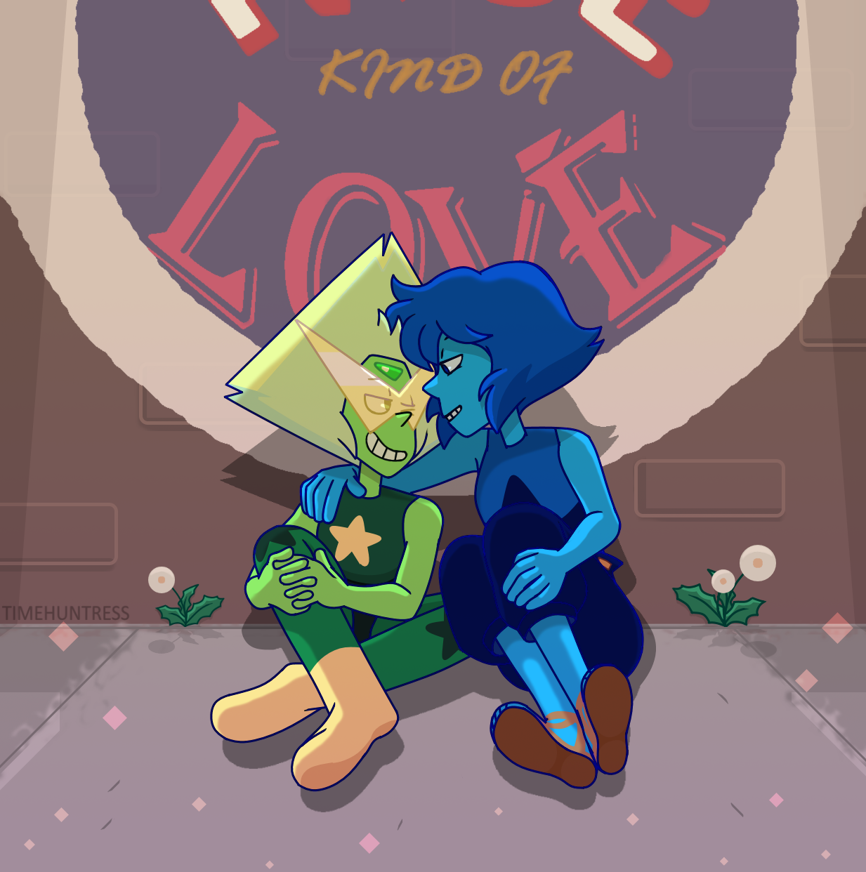 2girls arm_around_shoulder blue_hair blue_skin clenched_teeth colored_skin commentary english_commentary eye_contact gem gem_(steven_universe) green_gem green_hair green_skin highres lapis_lazuli_(steven_universe) leotard looking_at_another multiple_girls on_floor peridot_(steven_universe) sitting smile star_(symbol) steven_universe teeth timehuntress triangle-shaped_hair yuri