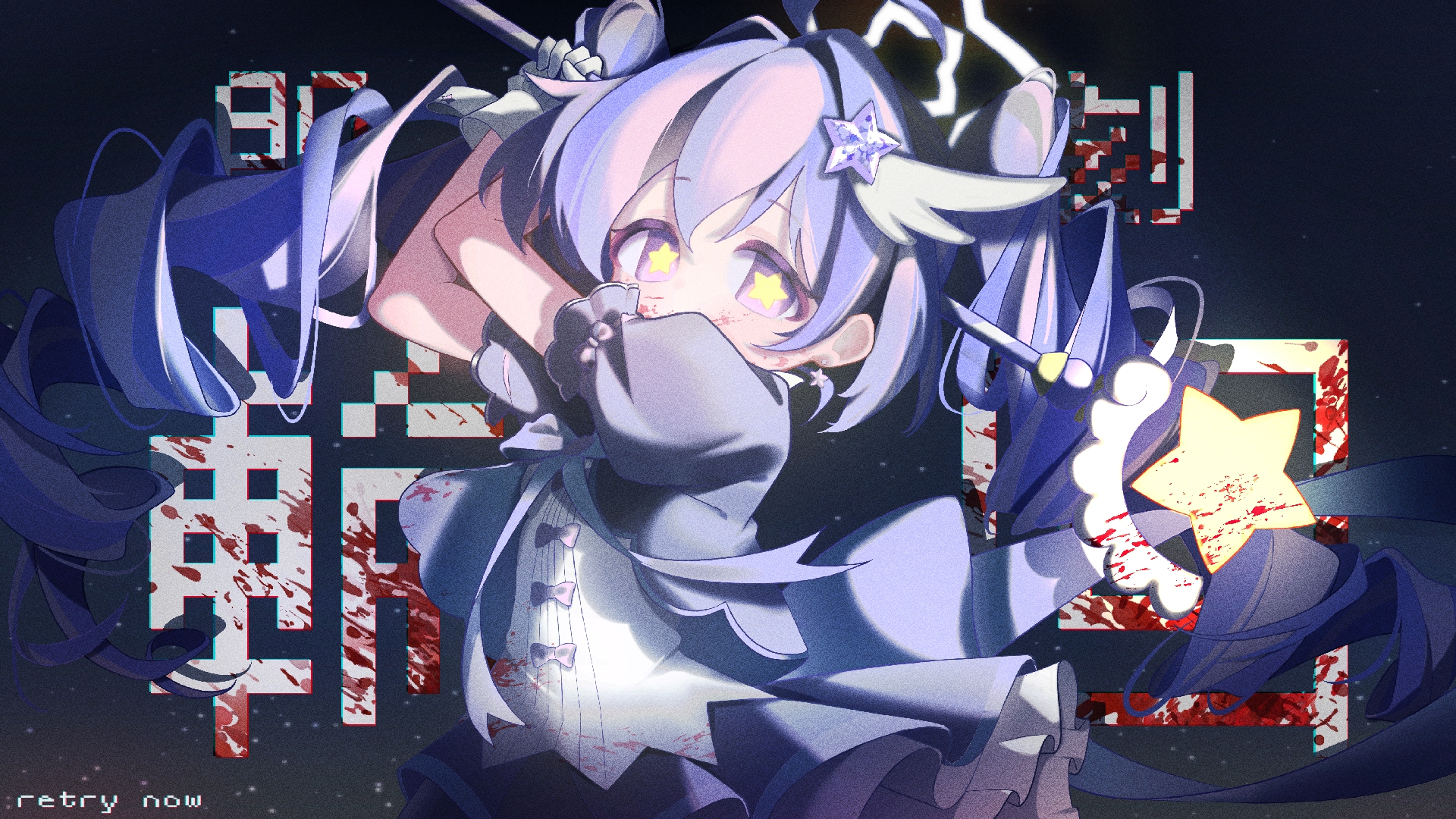 1girl ahoge aliasing arms_up blood blood_on_clothes blood_on_face blood_splatter blue_archive bow chinese_commentary commentary_request dark_background drill_hair earrings film_grain gloves hair_ornament highres holding holding_staff ima_sugu_rinne_(vocaloid) jacket jewelry long_hair looking_at_viewer magical_girl making-of_available multicolored_hair official_alternate_costume official_alternate_hairstyle pink_bow pink_hair puffy_short_sleeves puffy_sleeves purple_eyes purple_hair purple_jacket purple_skirt reisa_(blue_archive) reisa_(magical)_(blue_archive) short_sleeves skirt sleeve_bow snowmariz solo staff star-shaped_pupils star_(symbol) star_earrings star_hair_ornament symbol-shaped_pupils text_background twin_drills twintails two-tone_hair very_long_hair white_gloves white_wrist_cuffs wing_hair_ornament wrist_cuffs