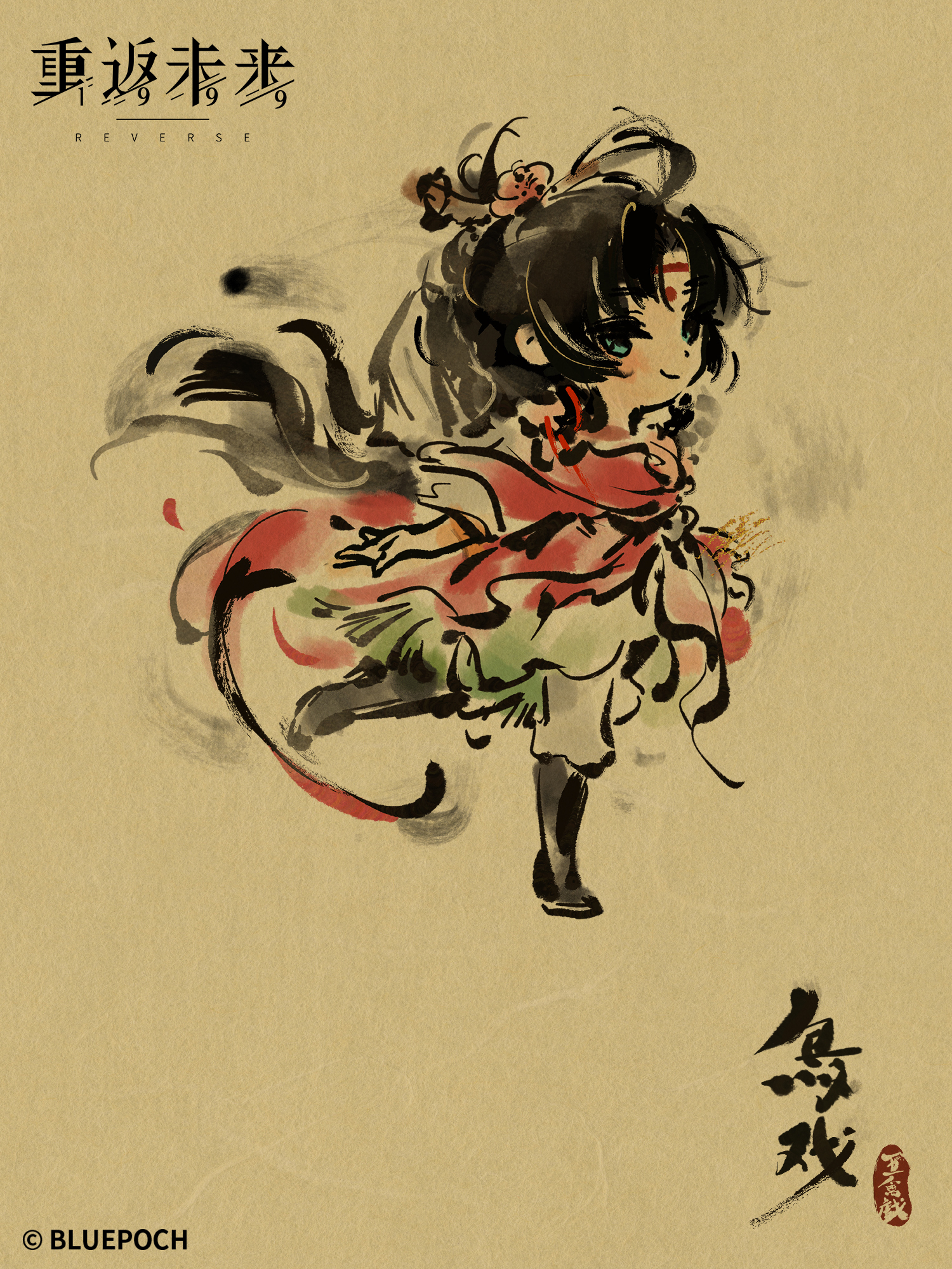 1girl black_boots black_hair blue_eyes boots calligraphy chibi chibi_only chinese_clothes chinese_commentary chinese_text commentary_request copyright_name copyright_notice exercising facial_mark faux_traditional_media forehead_mark from_side full_body hair_bun hanfu highres ink_wash_painting leg_up logo long_hair looking_at_viewer official_art pants paper_heron paper_texture red_hanfu reverse:1999 solo standing standing_on_one_leg white_pants yellow_background
