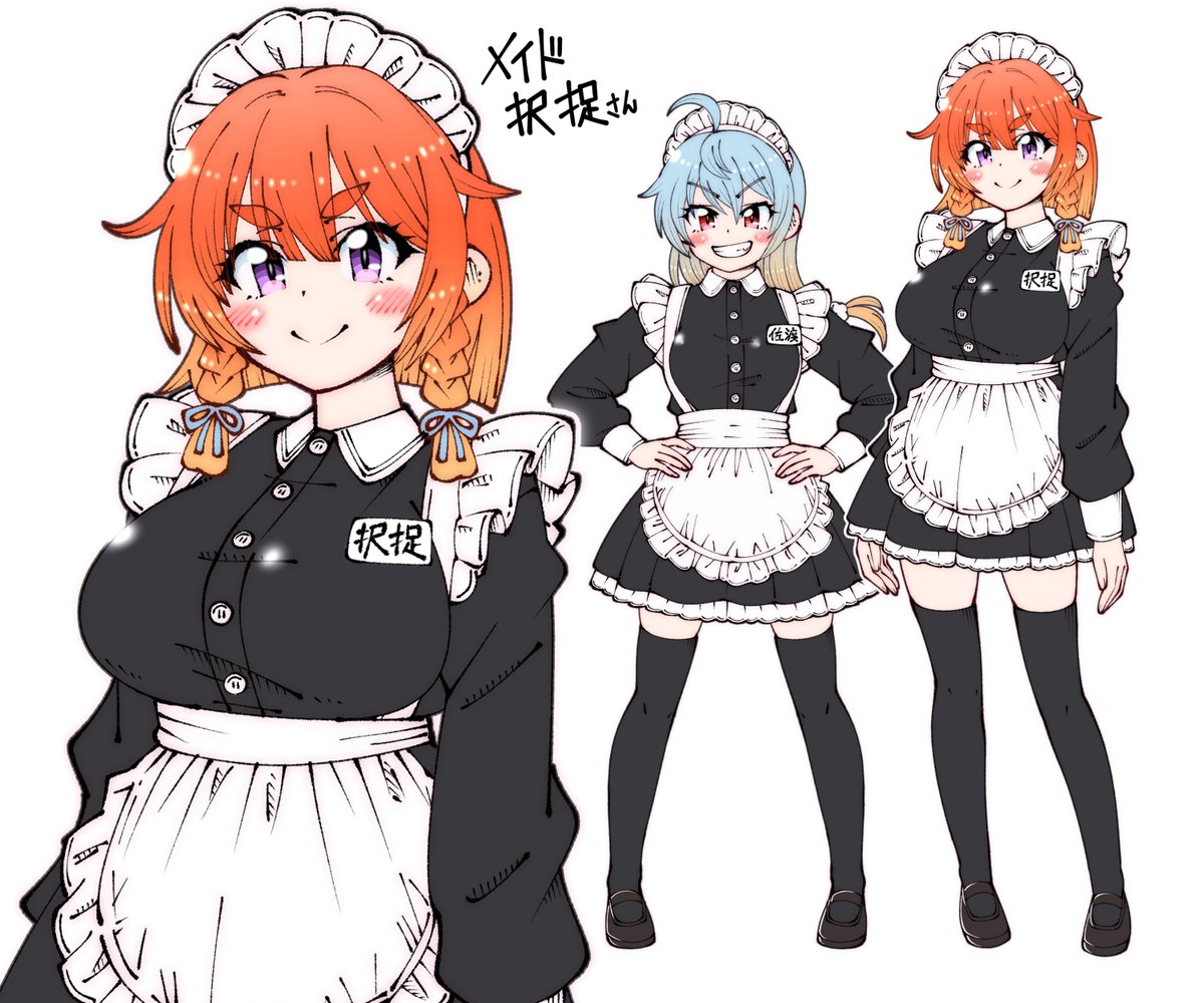 2girls aged_up ahoge alternate_breast_size_(larger) alternate_costume apron black_dress black_thighhighs blue_hair braid breasts commentary_request cowboy_shot dress enmaided etorofu_(kancolle) frilled_apron frills full_body grin hands_on_own_hips kantai_collection large_breasts long_hair maid maid_headdress multiple_girls multiple_views name_tag orange_hair purple_eyes red_eyes sado_(kancolle) shin_(shin_k009) short_dress short_hair side_braid smile solo_focus thick_eyebrows thighhighs twin_braids white_apron