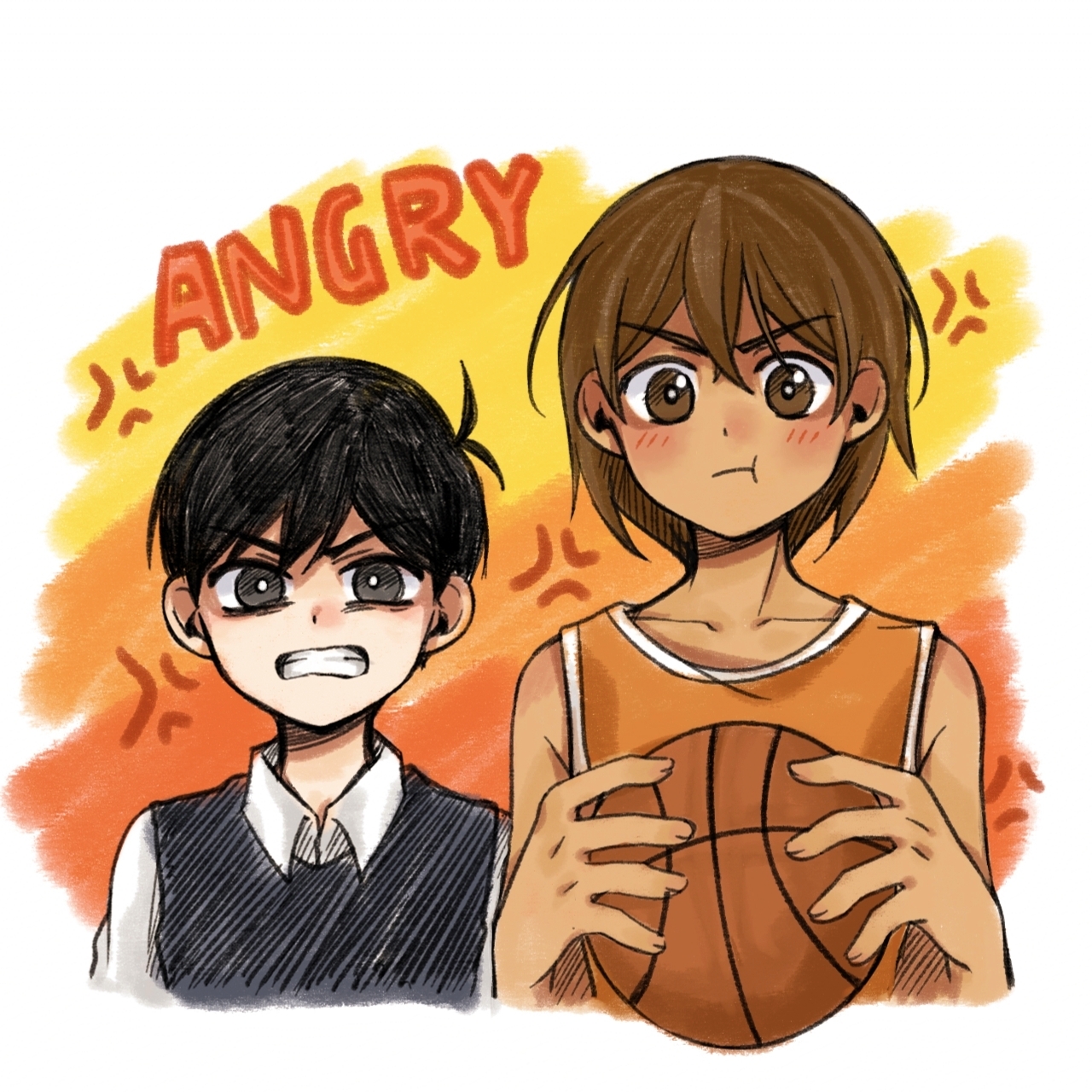 2boys alternate_eye_color anger_vein angry antenna_hair ball basketball_(object) black_eyes black_hair black_sweater_vest bright_pupils brown_eyes brown_hair chinese_commentary closed_mouth collarbone collared_shirt commentary_request double-parted_bangs english_text hair_between_eyes highres holding holding_ball kel_(faraway)_(omori) kel_(omori) linglanjunying looking_at_viewer male_focus multiple_boys omori open_mouth pout shirt short_hair sunny_(omori) sweater_vest teeth white_pupils white_shirt