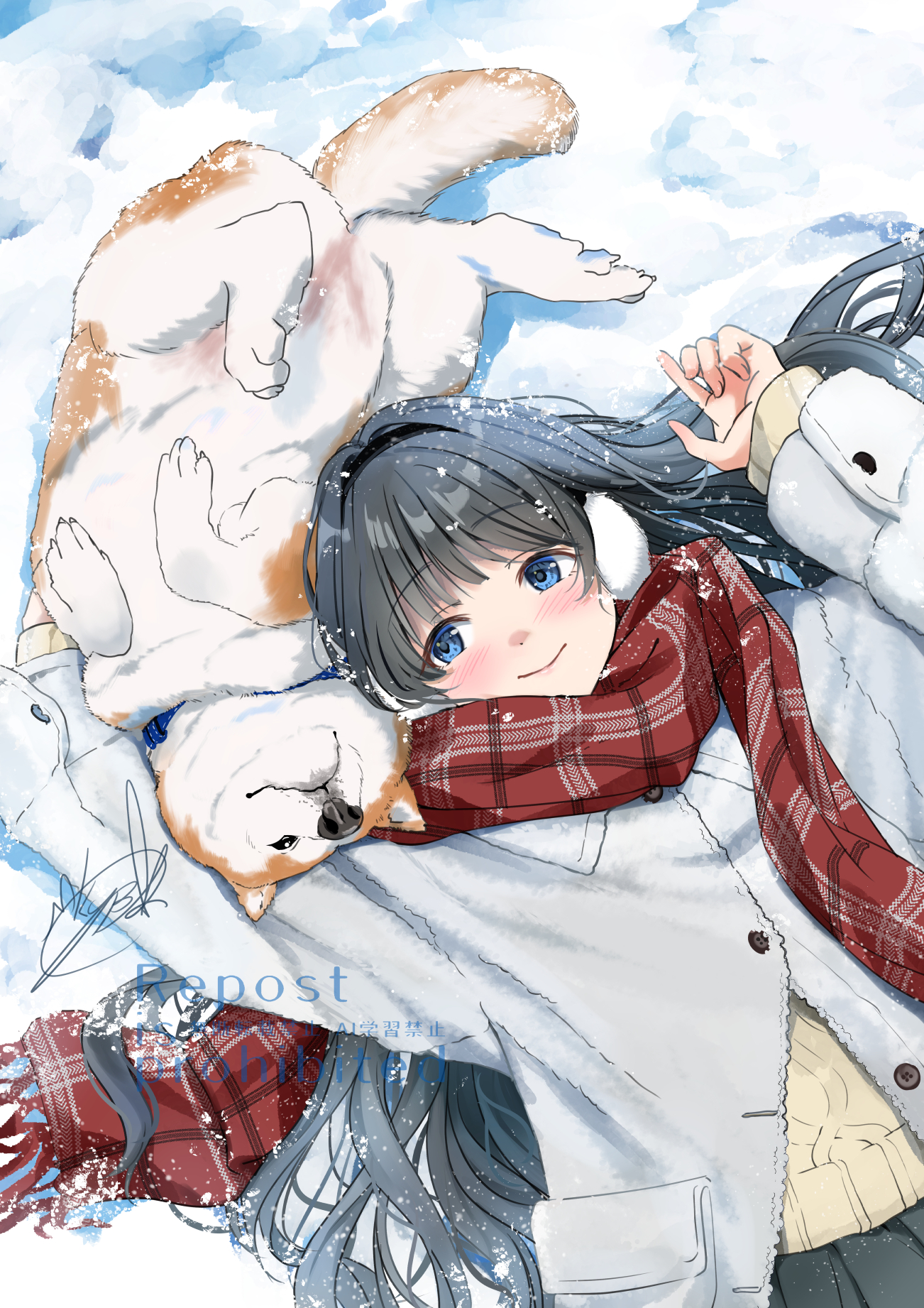 1girl black_hair blue_eyes brown_sweater closed_mouth coat commentary_request dog earmuffs highres long_hair lying on_back original red_scarf scarf shiba_inu signature smile snow soragane_(banisinngurei) sweater white_coat