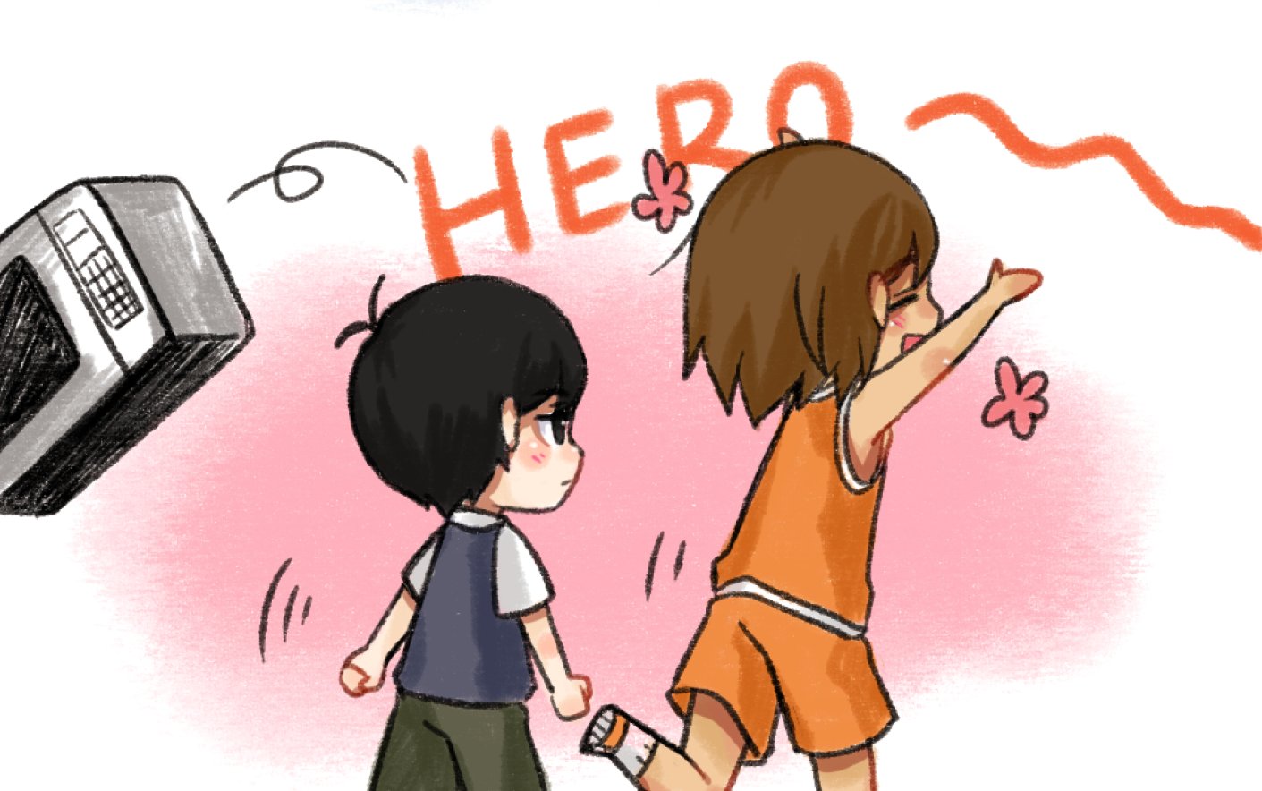2boys antenna_hair black_eyes black_hair black_sweater_vest blush brown_shorts closed_eyes collared_shirt commentary dark-skinned_male dark_skin english_commentary kel_(faraway)_(omori) kel_(omori) linglanjunying male_focus microwave multiple_boys omori open_mouth orange_shorts shirt short_hair short_sleeves shorts smile socks sunny_(omori) sweater_vest white_shirt white_socks
