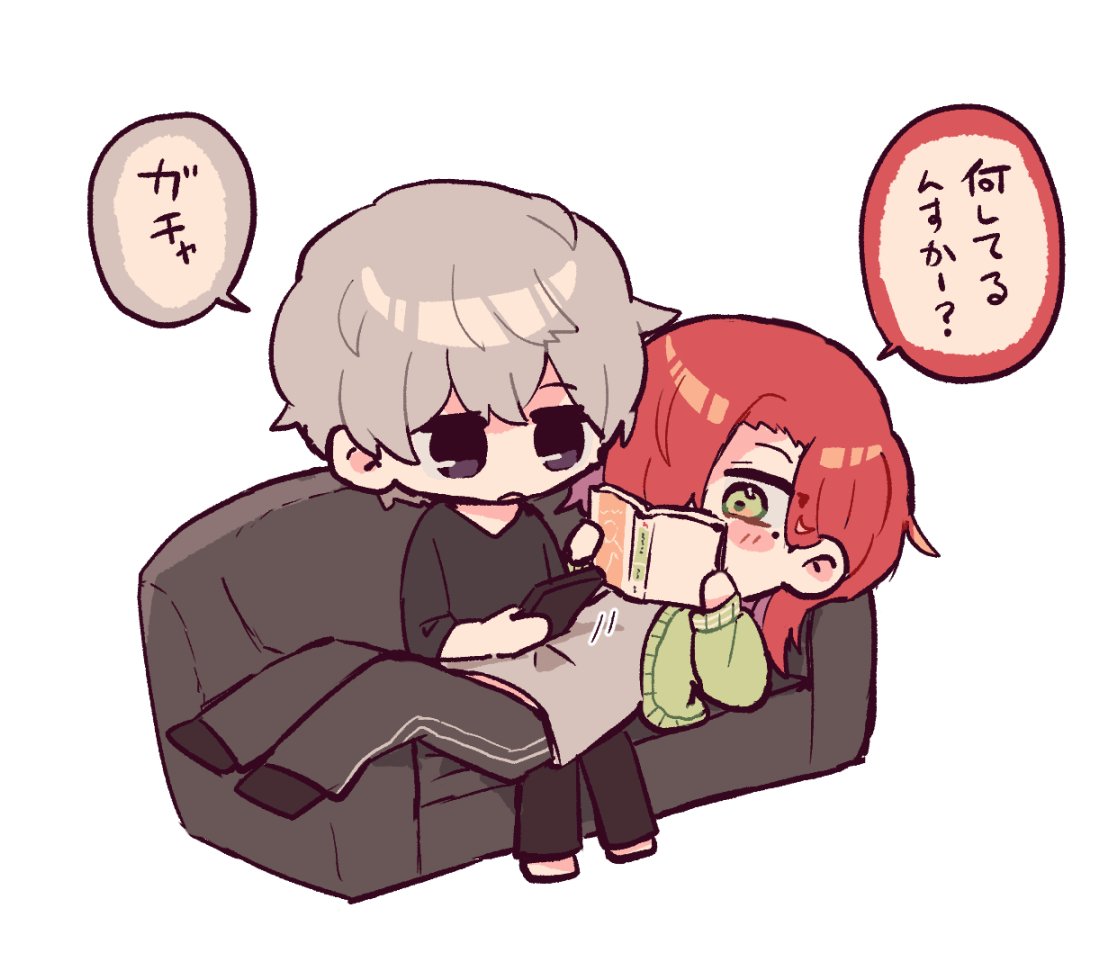 2boys barefoot black_eyes black_shirt blush_stickers book cardigan casual cellphone chibi chibi_only commentary_request couch green_cardigan green_eyes grey_hair holding holding_book holding_phone hyoutenka_30-do_no_zetsubou indoors kuchinashi_dabi lying male_focus medium_hair midriff_peek multiple_boys no_fingers okudo61 on_back on_couch phone reading red_hair shirt simple_background sitting smartphone tonimura_yui translation_request white_background