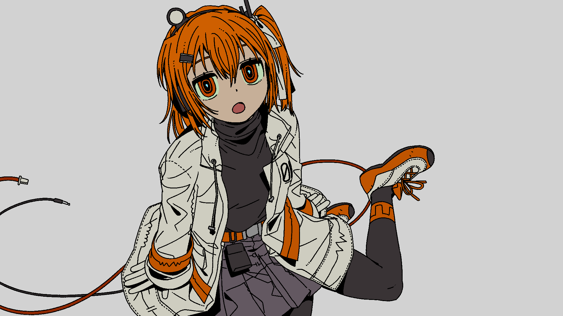1girl a.i._voice adachi_rei belt black_pantyhose black_shirt cable coat commentary_request dot_nose gloves grey_background grey_skirt hair_between_eyes hair_ribbon headphones highres long_sleeves looking_at_viewer looking_up medium_hair one_side_up open_clothes open_coat open_mouth orange_eyes orange_hair pantyhose pouch ribbon shirt shirt_tucked_in shoes sitting skirt sneakers solo turtleneck utau wariza white_coat white_gloves yugu_(yugu2000)
