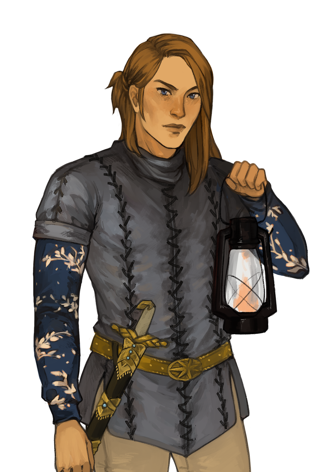 1boy aegyo_sal armor arrapso bemelle blue_eyes brown_hair cowboy_shot facing_viewer gas_lantern highres holding holding_lantern lake_of_voices lantern looking_at_viewer male_focus medium_hair non-web_source official_art one_side_up scabbard self-datamine serious sheath sidelocks solo sword tachi-e tunic weapon