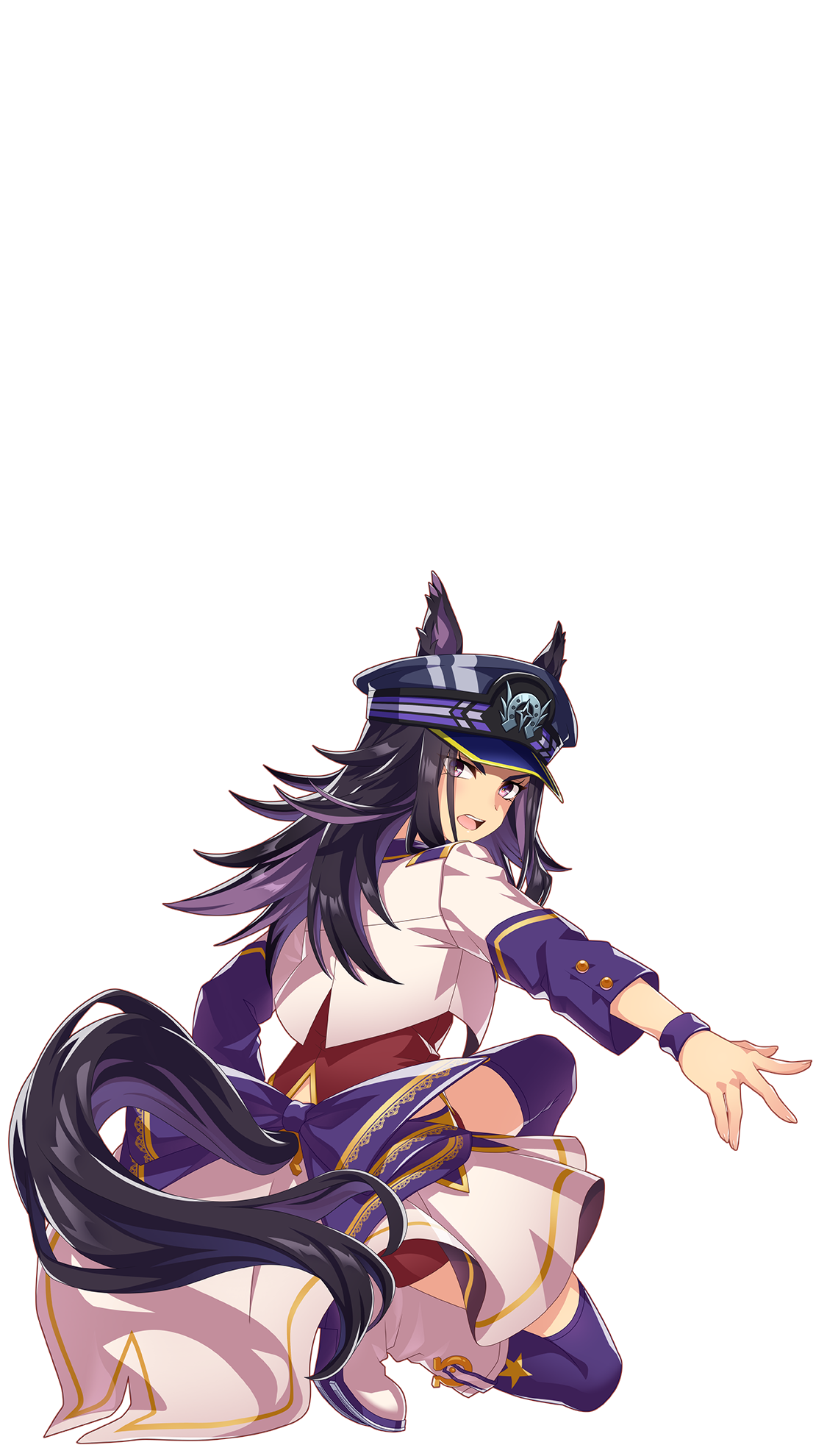 1girl animal_ears black_hair blush bodice boots corset cropped_jacket ears_through_headwear fenomeno_(umamusume) flipped_hair hat highres horse_ears horse_girl horse_tail jacket kneeling long_hair long_sleeves looking_at_viewer multicolored_hair official_alternate_costume official_art open_mouth overskirt peaked_cap purple_eyes purple_hair purple_thighhighs red_corset red_shorts shorts simple_background starting_future_(umamusume) tail thighhighs transparent_background umamusume white_boots white_jacket wristband