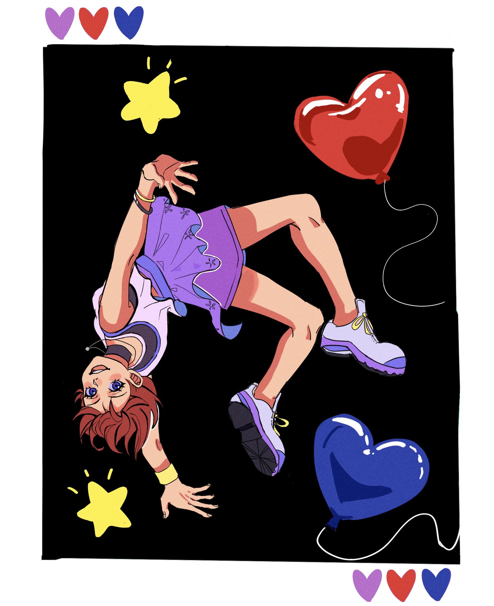 1girl balloon bare_shoulders black_background black_choker blue_eyes border bracelet breasts byo_rk camisole choker commentary floating frilled_skirt frills full_body heart_balloon highres jewelry kairi_(kingdom_hearts) kingdom_hearts medium_breasts miniskirt necklace purple_skirt red_hair shirt shoes short_hair skirt sleeveless sleeveless_shirt solo undershirt untranslatable_commentary white_border white_camisole white_shoes wristband