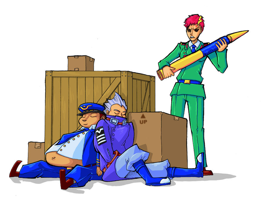 1girl 2boys advance_wars angry aviator_sunglasses boots box chevron_(symbol) coat crate drake_(advance_wars) eagle_(advance_wars) exposed_fat fat fat_man hat holding_tank_shell jess_(advance_wars) military_uniform multiple_boys navel necktie overcoat peaked_cap red_hair sailor shirt sleeping sunglasses tank_shell white_hair white_shirt wildragon_(artist) wooden_box
