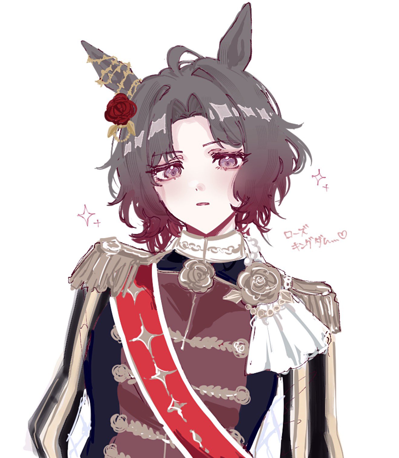 1girl ahoge animal_ears ascot blue_jacket character_name commentary_request crossdressing crossdressing_(ftm) dot_nose ear_ornament epaulettes expressionless eyelashes flower formal_clothes gold_buttons gradient_hair grey_hair hair_flower hair_intakes hair_ornament highres horse_ears horse_girl jacket multicolored_hair multicolored_jacket parted_bangs parted_lips pink_eyes ranpo_rikyu0102 red_flower red_hair red_jacket red_rose red_sash rose rose_kingdom_(umamusume) sash short_hair simple_background solo sparkle thorns two-tone_hair two-tone_jacket umamusume upper_body vertical-striped_sleeves white_ascot white_background