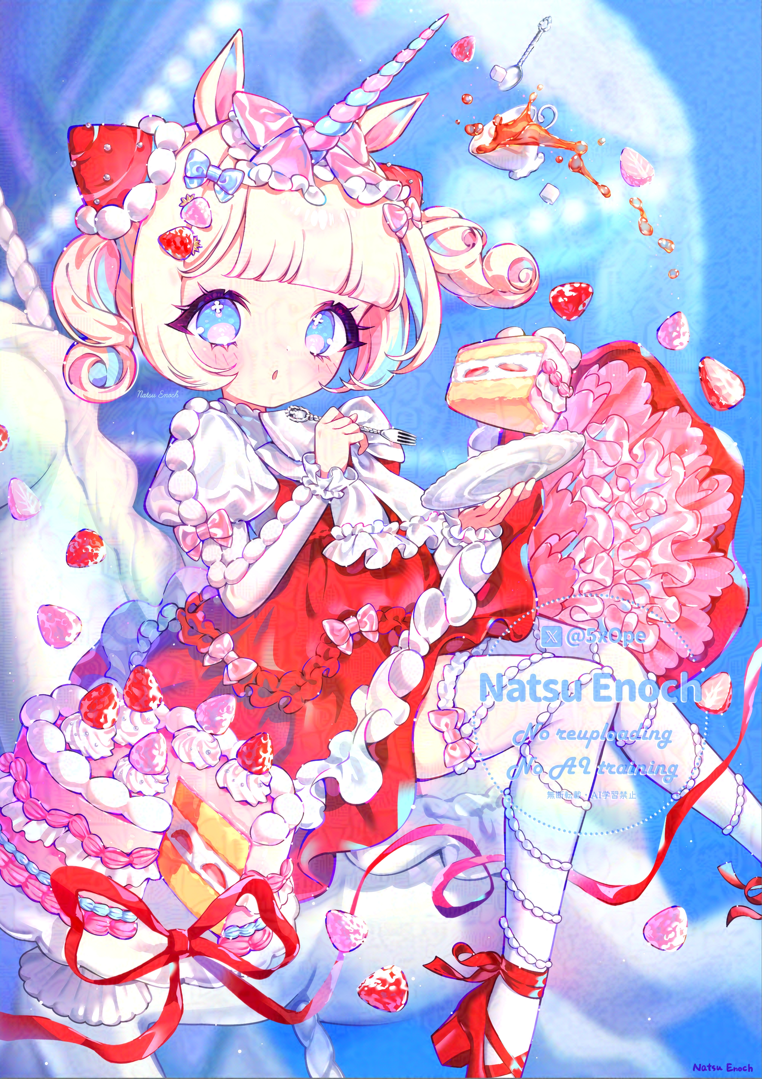 1girl :o absurdres animal_ears artist_name blonde_hair blue_bow blue_eyes blue_hair bow cake cup dress food food-themed_hair_ornament fork frilled_dress frills hair_bow hair_ornament highres holding holding_fork horse_ears looking_at_viewer multicolored_hair multiple_hair_bows natsu_enoch open_mouth original over-kneehighs pink_bow pink_hair puffy_short_sleeves puffy_sleeves red_ribbon red_shoes ribbon shoes short_sleeves shortcake-chan_(natsu_enoch) solo strawberry_cake strawberry_hair_ornament strawberry_shortcake streaked_hair symbol_in_eye teacup thighhighs unicorn_girl unicorn_horn white_bow