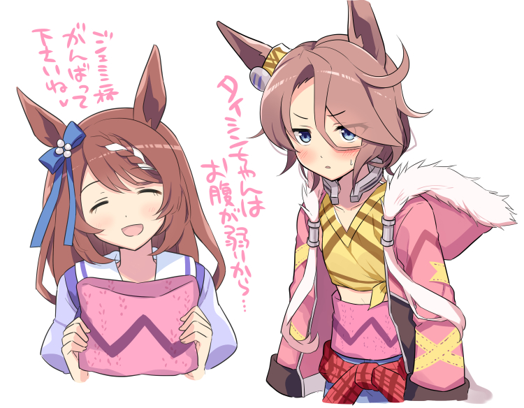 2girls :d ^_^ animal_ears blue_eyes blue_pants blush braid brown_hair closed_eyes clothes_around_waist commentary_request eyes_visible_through_hair fur-trimmed_hood fur_trim hair_between_eyes hood hood_down hooded_jacket horse_ears horse_girl horse_tail jacket long_hair multiple_girls narita_taishin_(nevertheless)_(umamusume) narita_taishin_(umamusume) odawara_hakone open_mouth pants parted_lips pink_jacket shirt simple_background smile super_creek_(umamusume) tail translation_request umamusume v-shaped_eyebrows white_background yellow_shirt