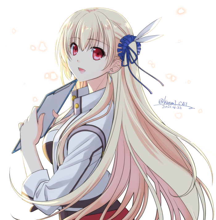alisa_reinford blonde_hair commentary_request eiyuu_densetsu feather_hair_ornament feathers hair_ornament light_smile long_hair morisaki_kurumi red_eyes sen_no_kiseki_(series) simple_background smile white_feathers