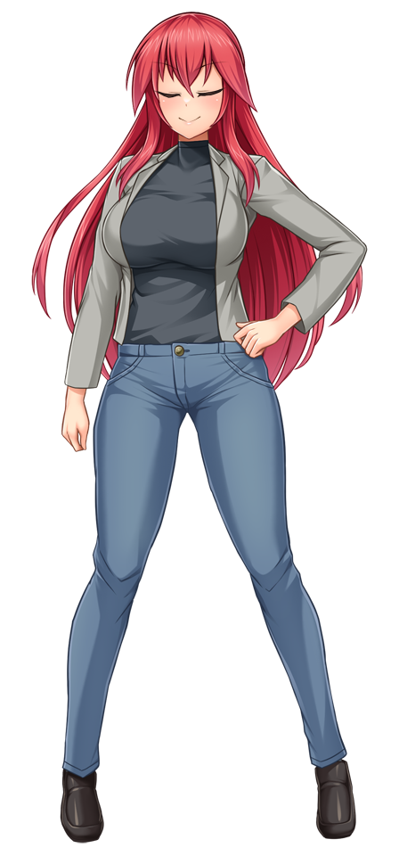 1girl arm_at_side black_shirt blue_pants blush breasts casual closed_eyes closed_mouth denim facing_viewer full_body game_cg grey_jacket hair_between_eyes hand_on_own_hip ikameshi_(nega96396) jacket jeans large_breasts large_variant_set legs_apart long_hair long_sleeves metis_(seisenki_iris) non-web_source official_art open_clothes open_jacket pants red_hair seisenki_iris self-datamine shirt shoes smile solo standing tachi-e transparent_background turtleneck variant_set