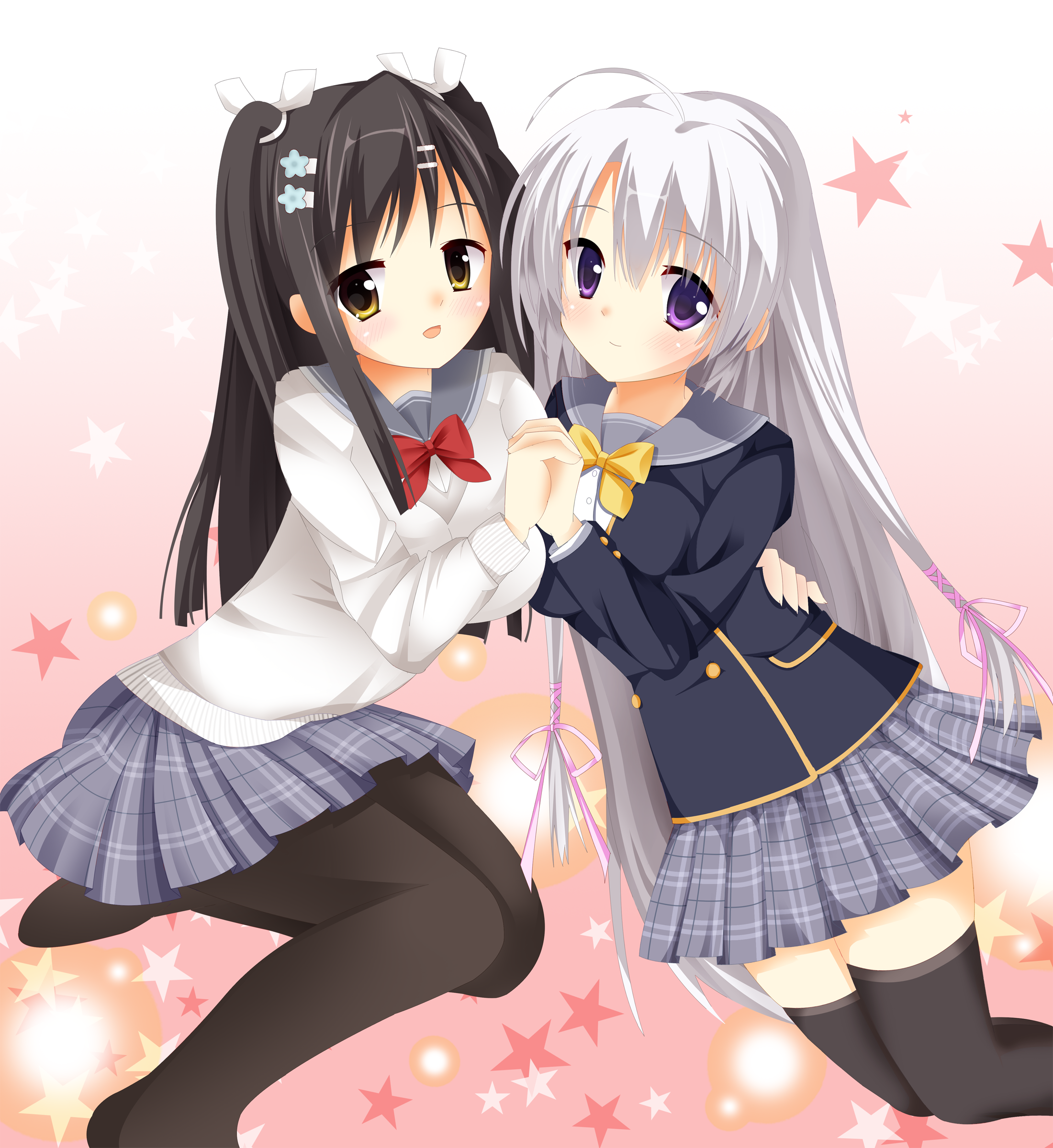 2girls :d absurdres ahoge ayachi_nene black_jacket black_pantyhose black_thighhighs blunt_ends blush bow bowtie breast_press breasts buttons closed_mouth commentary_request double-breasted eyes_visible_through_hair feet_out_of_frame gradient_background grey_hair grey_sailor_collar grey_skirt hair_between_eyes hair_ornament hair_ribbon hairclip hand_up highres holding_hands hug interlocked_fingers jacket kouyou_minami large_breasts long_hair long_sleeves looking_at_viewer miniskirt multiple_girls open_mouth pantyhose parallel_hairclips pink_background pink_ribbon plaid_clothes plaid_skirt pleated_skirt purple_eyes red_bow red_bowtie ribbon sailor_collar sanoba_witch school_uniform serafuku sidelocks simple_background sitting skirt smile star_(symbol) star_symbol_background straight_hair sweater symmetrical_docking thighhighs togakushi_touko two_side_up very_long_hair white_background white_ribbon white_sweater yellow_bow yellow_bowtie yellow_eyes yokozuwari zettai_ryouiki