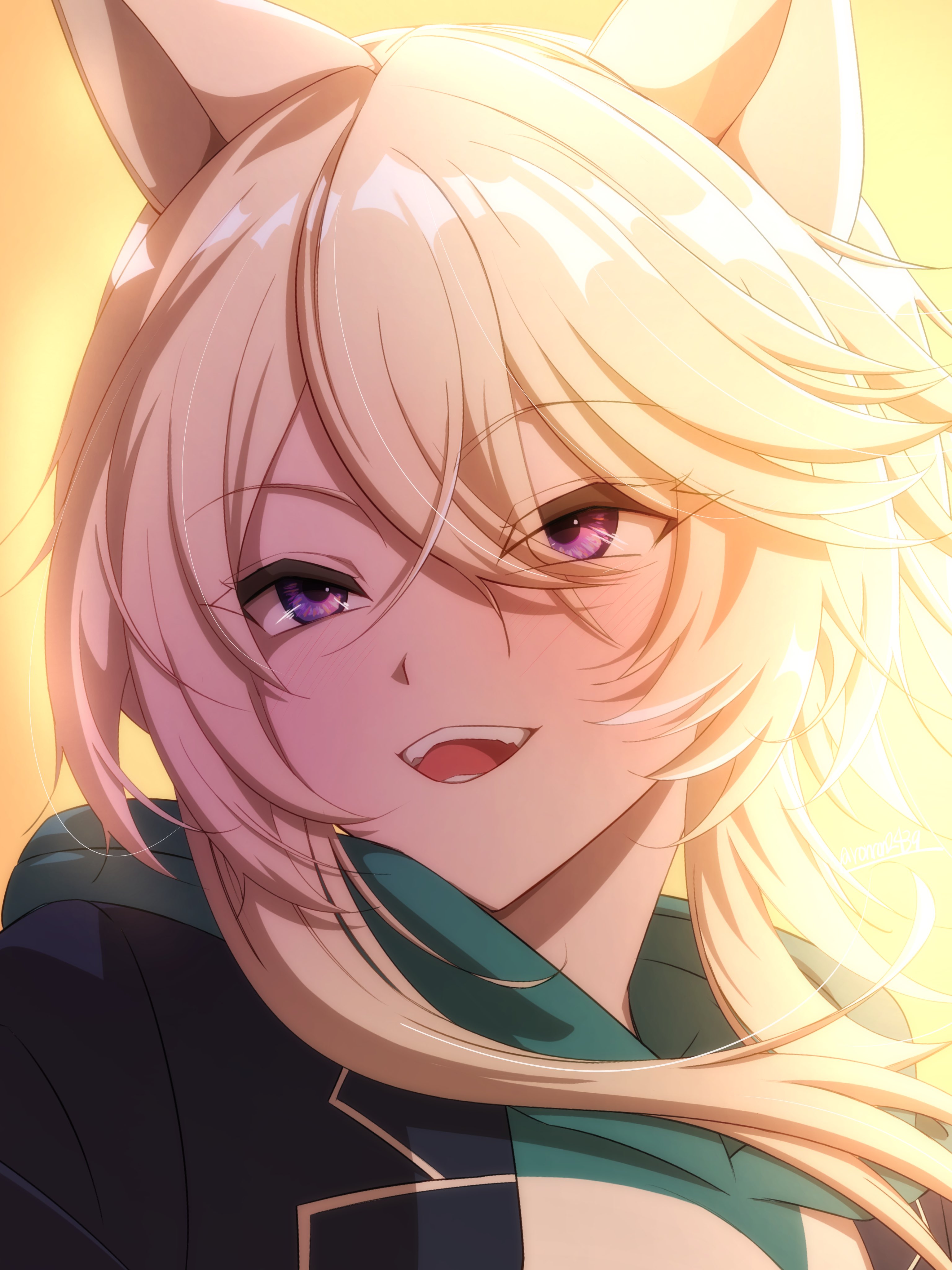 1girl absurdres animal_ears blonde_hair cat_ears cat_girl commentary_request hair_between_eyes highres kage_no_jitsuryokusha_ni_naritakute! kage_no_jitsuryokusha_ni_naritakute!_master_of_garden open_mouth purple_eyes ronron2439 short_hair_with_long_locks smile solo teeth zeta_(kagejitsu)