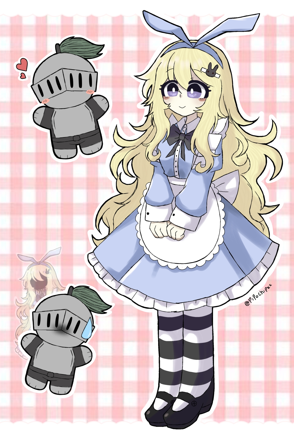 1girl alice_(black_souls) apron armor back_bow black_bow black_bowtie black_shoes black_souls black_souls_2 blonde_hair blue_dress blue_ribbon blush_stickers bow bowtie bright_pupils buttons chibi chibi_inset closed_mouth collared_dress dress frilled_apron frilled_dress frills grid_background grimm_(black_souls) hair_ornament hairclip heart helmet knight long_hair pink_background pipo_(pipochipzz) purple_eyes ribbon shoes sidelocks smile solo striped_clothes striped_thighhighs thighhighs twitter_username very_long_hair white_apron white_bow white_pupils