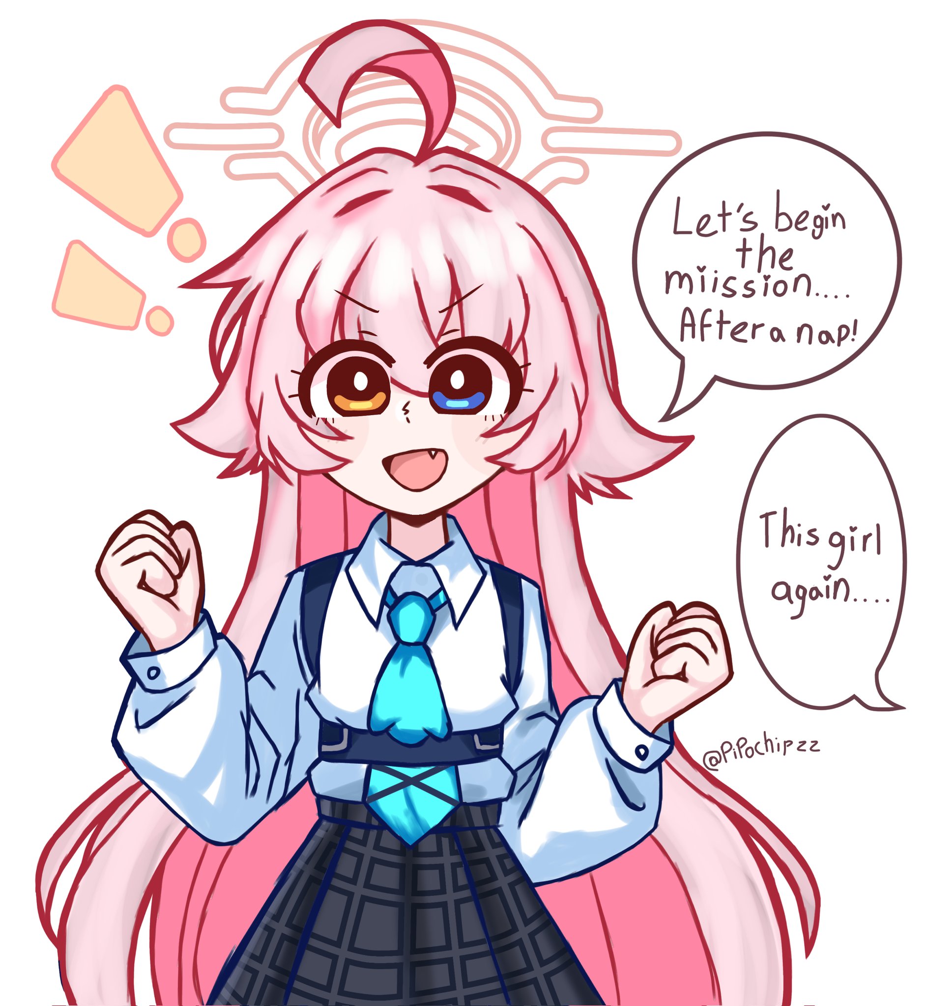 1girl ahoge blue_archive blue_necktie clenched_hands collared_shirt english_text fang halo heterochromia hoshino_(blue_archive) huge_ahoge long_hair looking_at_viewer necktie open_mouth pink_hair pink_halo pipo_(pipochipzz) plaid_clothes plaid_skirt shirt skirt solo speech_bubble straight-on suspenders twitter_username upper_body very_long_hair white_shirt
