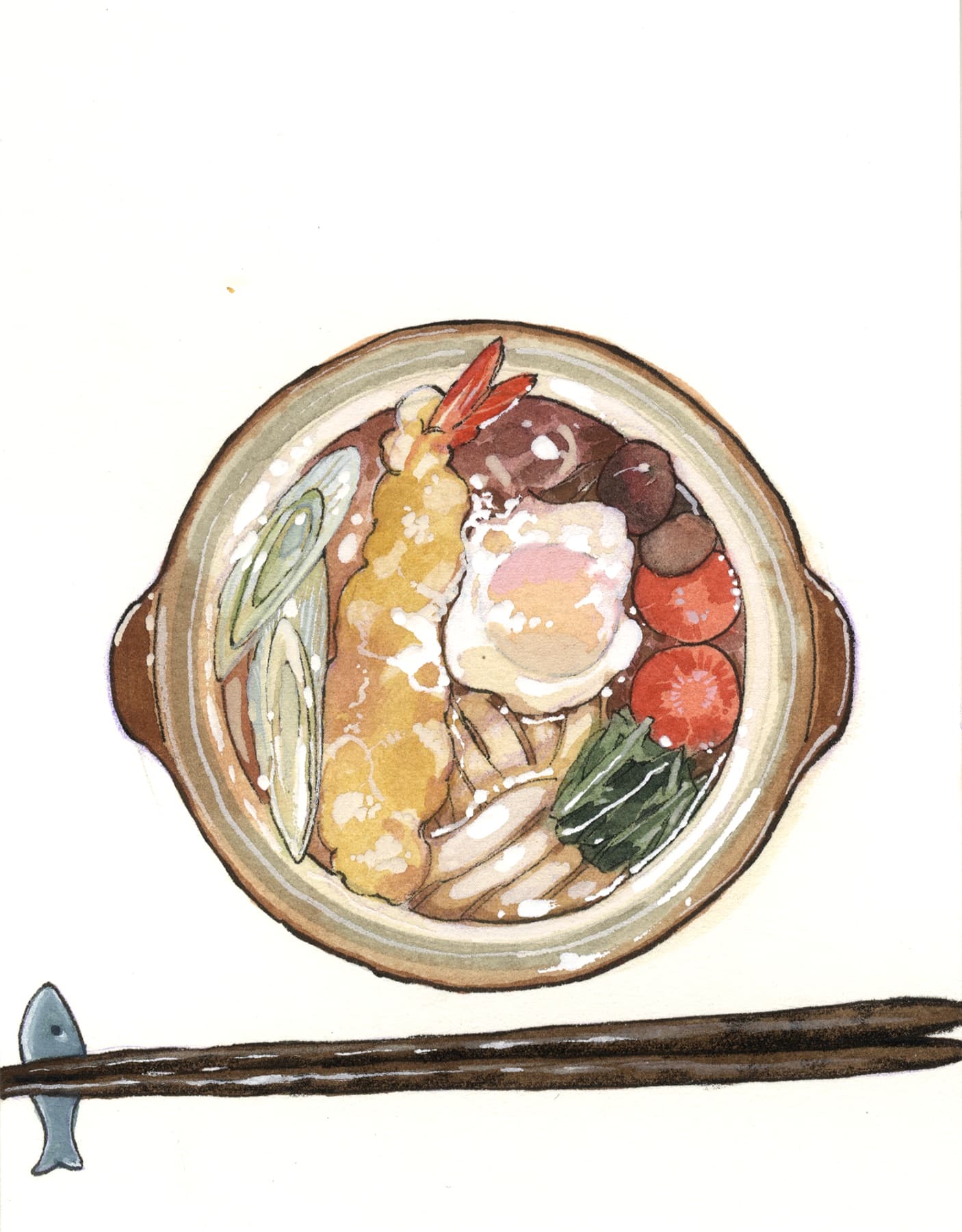 bowl chopstick_rest chopsticks food food_focus fried_egg highres mushroom no_humans noodles original painting_(medium) peach_momoko second-party_source tempura traditional_media udon watercolor_(medium) white_background
