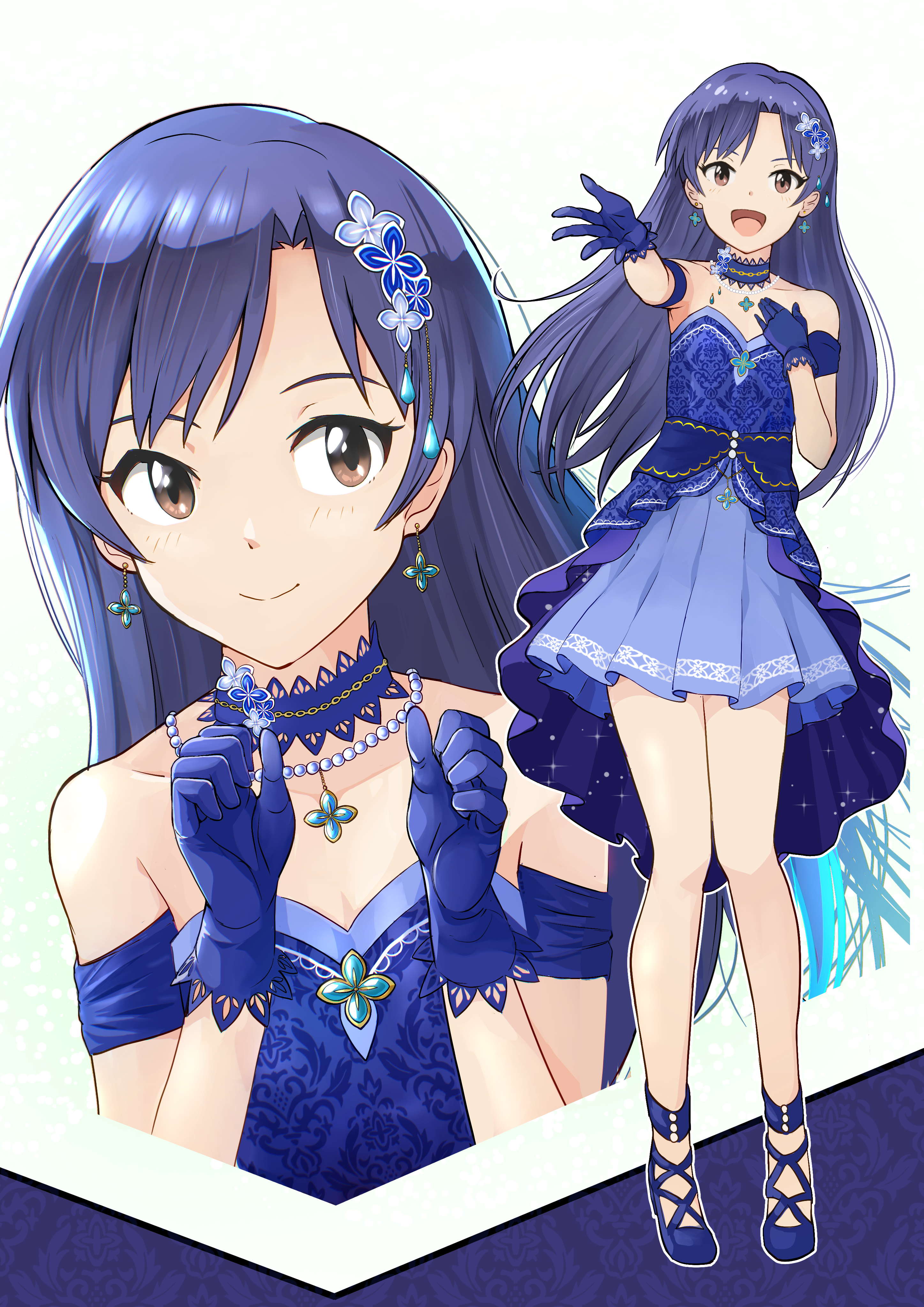 1girl :d absurdres bare_shoulders blue_choker blue_dress blue_gloves blue_hair brown_eyes choker closed_mouth commentary_request dress earrings flat_chest gloves hair_ornament highres idolmaster idolmaster_(classic) idolmaster_million_live! idolmaster_million_live!_theater_days jewelry kisaragi_chihaya kisaragi_chihaya_(brilliant_diva) long_hair multiple_views noborinosato official_alternate_costume open_mouth outstretched_arm sideways_glance smile smoke standing strapless strapless_dress white_background zoom_layer