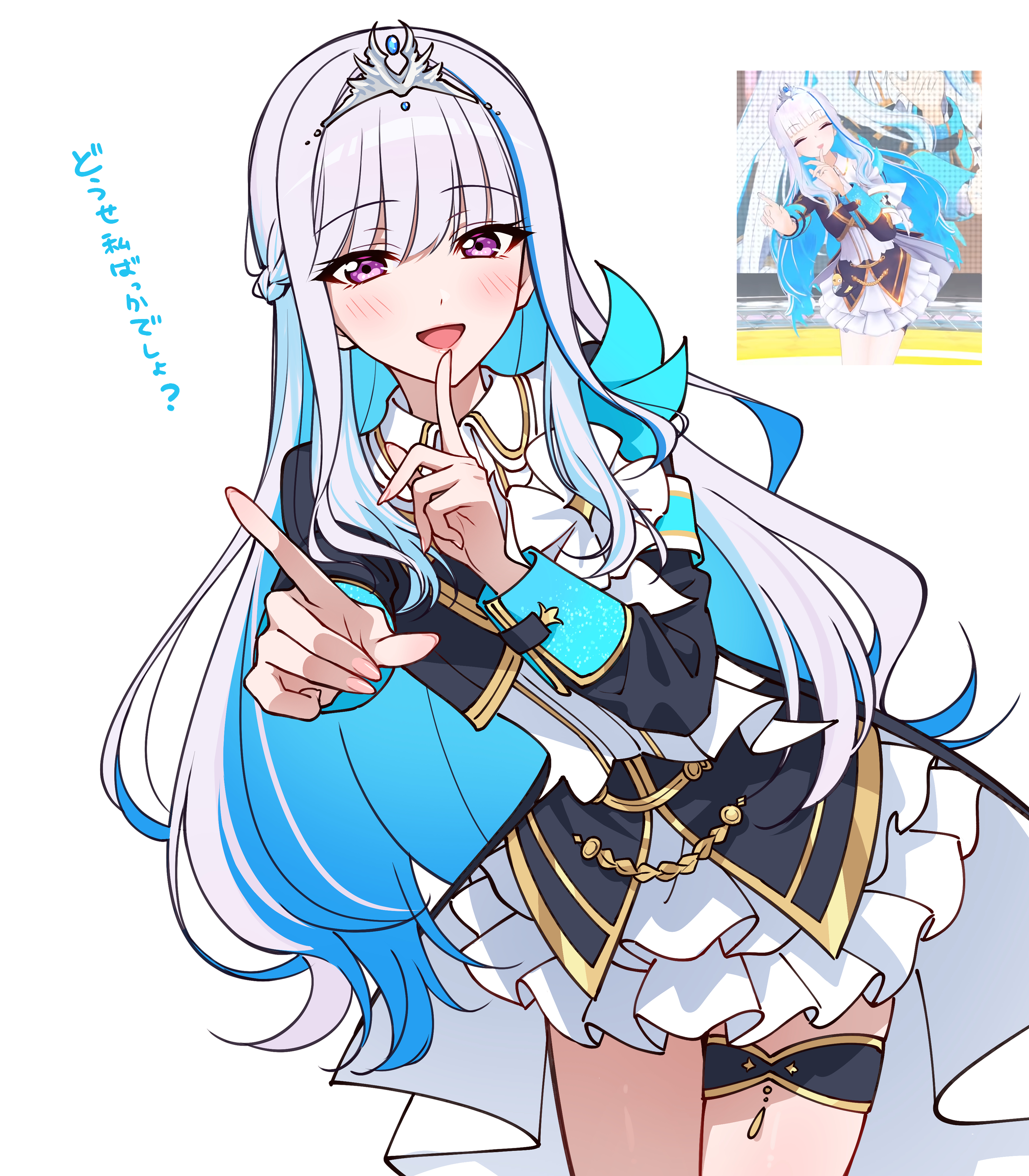 1girl :d absurdres armband black_jacket blue_armband blue_hair colored_inner_hair commentary_request cowboy_shot cropped_jacket finger_to_mouth frilled_skirt frills highres jacket kougi_hiroshi leaning_to_the_side lize_helesta long_hair long_sleeves looking_at_viewer miniskirt multicolored_hair nijisanji nijisanji_idol_uniform open_mouth purple_eyes reference_inset screenshot_inset shirt short_sleeves shushing skirt smile solo standing striped_armband striped_clothes tiara translation_request very_long_hair virtual_youtuber white_hair white_shirt white_skirt