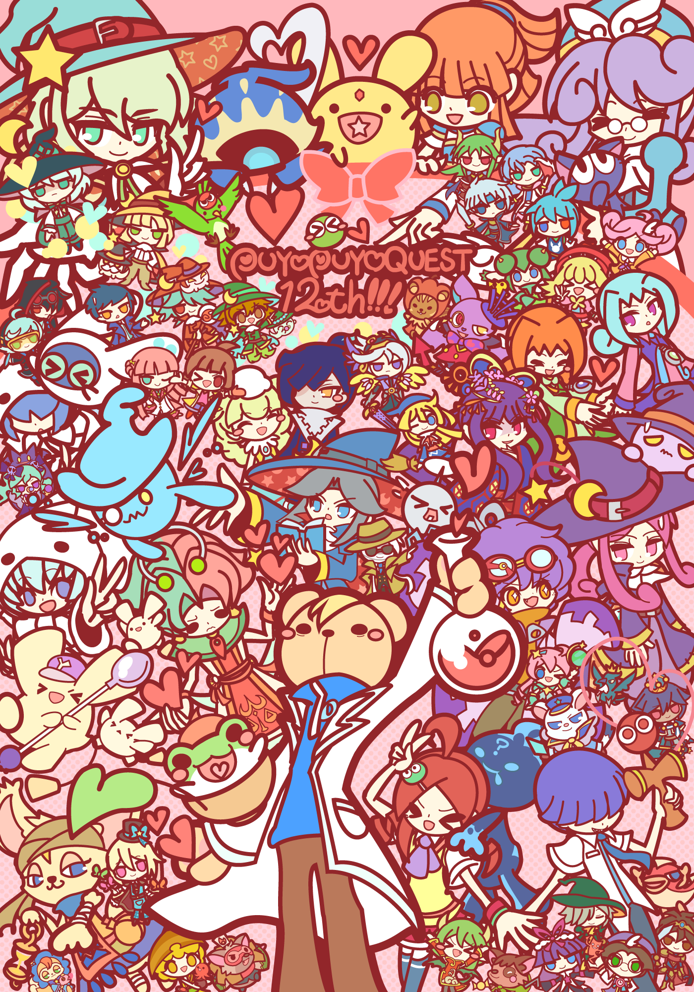 accord_sensei andou_ringo bird black_hair blonde_hair blue_eyes blue_hair blue_necktie blush_stickers book bow brown_eyes brown_hair character_request closed_eyes commentary_request copyright_name crescent crescent_hat_ornament draco_centauros ecolo_(puyopuyo) fang glasses green_eyes green_hair hair_ornament hair_over_eyes hair_over_one_eye hat hat_bow hat_ornament heart heterochromia highres holding holding_book kokodokopikka multicolored_hair necktie one_eye_closed open_mouth orange_eyes orange_hair pince-nez pink_hair purple_eyes purple_hair puyopuyo puyopuyo_quest red_eyes red_hair risukuma_(puyopuyo) rozatte_(puyopuyo) sasaki_maguro smile star_(symbol) star_hat_ornament sunglasses sword two-tone_hair v weapon yellow_eyes