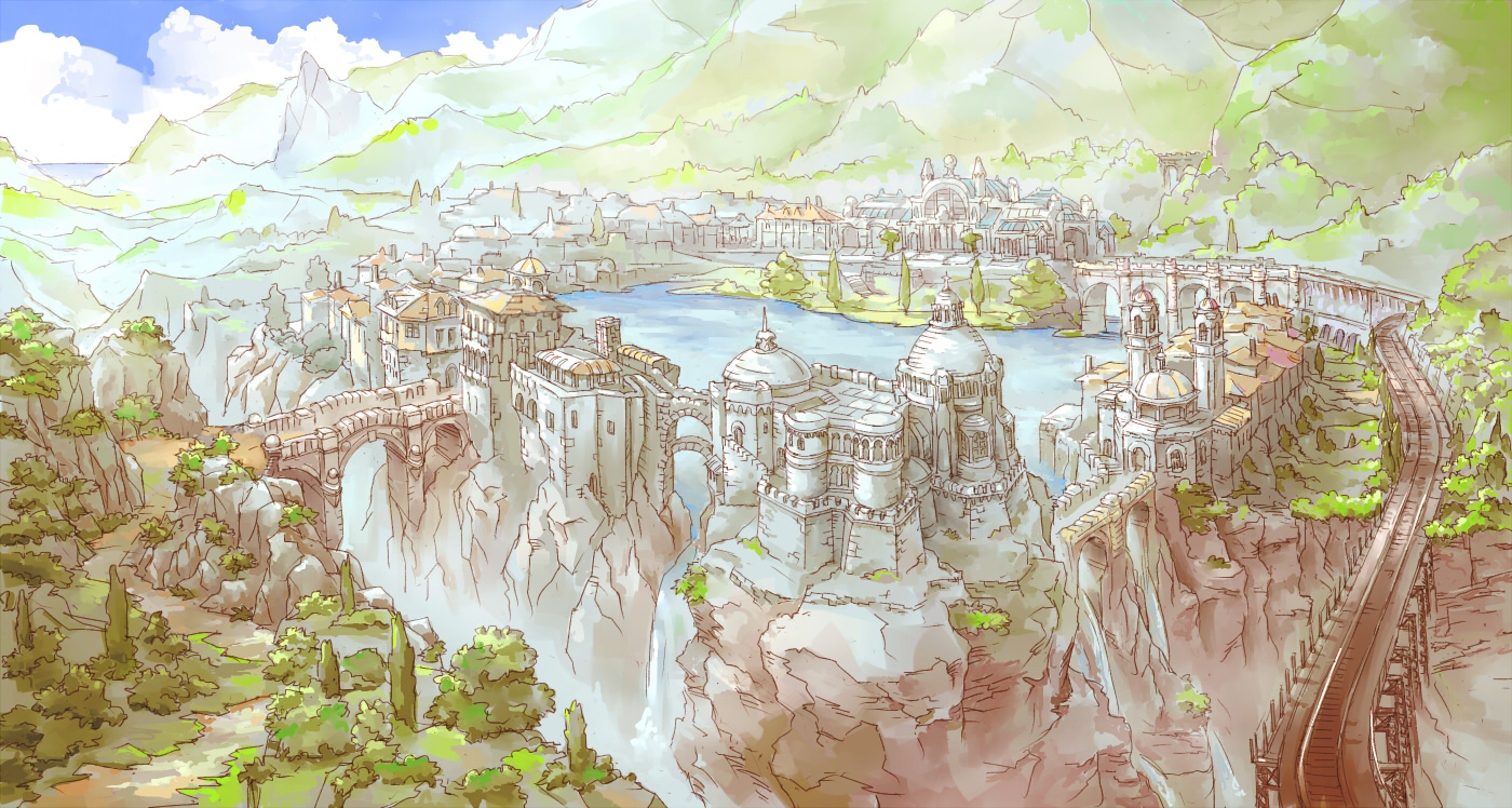 bridge cityscape cliff cloud coz_(commit) fantasy grand_scale lake mountain no_humans original railroad_tracks scenery sky town tree water waterfall