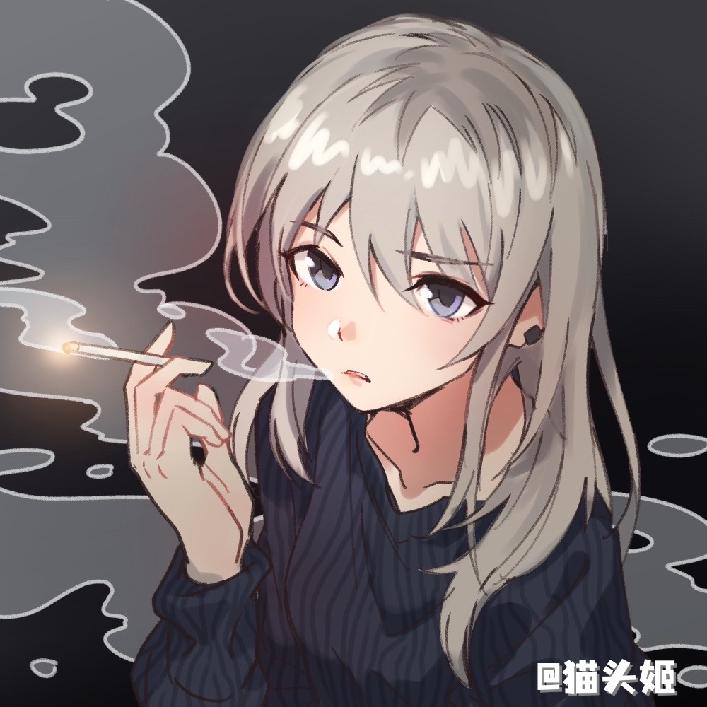 1girl black_battler black_sweater catowjeemson chinese_commentary cigarette collarbone commentary_request earclip girls_band_cry grey_eyes grey_hair hair_between_eyes holding holding_cigarette kawaragi_momoka long_hair long_sleeves looking_at_viewer multicolored_hair parted_lips roots_(hair) sidelocks smoke smoking solo sweater upper_body ushiromiya_battler