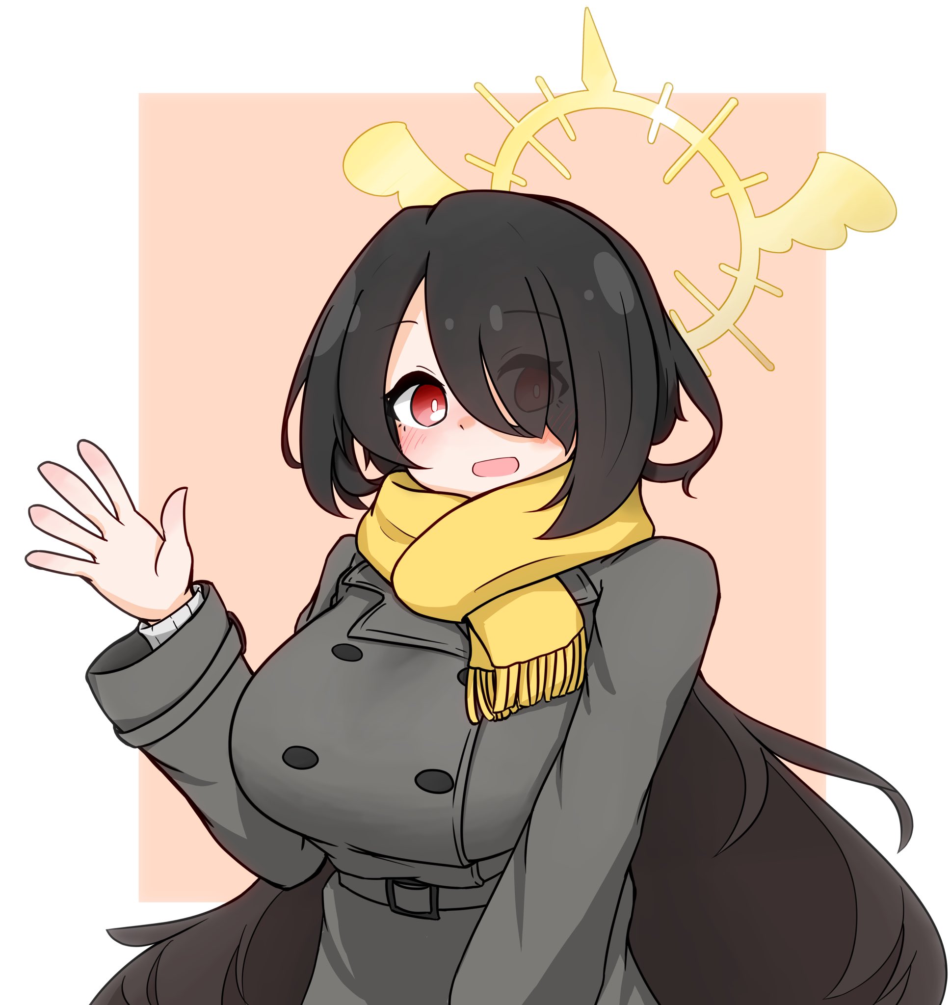 alternate_costume belt bkdikara black_hair blue_archive blush breasts bright_pupils coat commentary_request grey_belt grey_coat hair_over_one_eye halo hand_up highres hinata_(blue_archive) large_breasts long_hair long_sleeves looking_at_viewer open_mouth pink_background red_eyes scarf simple_background smile upper_body waving white_pupils yellow_halo yellow_scarf