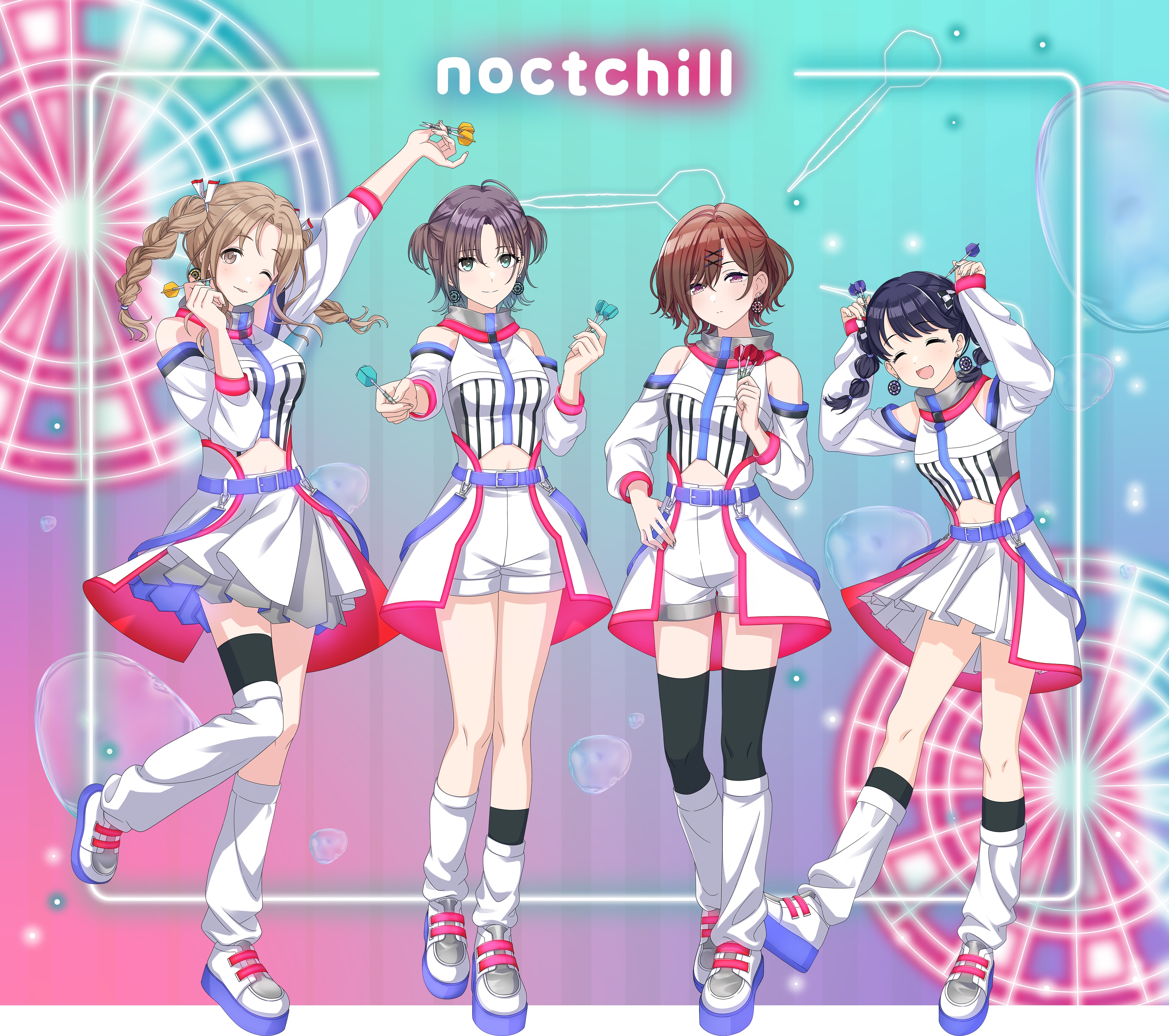 4girls absurdres asakura_toru bare_shoulders belt black_socks dart fukumaru_koito highres higuchi_madoka ichikawa_hinana idolmaster idolmaster_shiny_colors multiple_girls navel noctchill_(idolmaster) official_art open_mouth purple_belt shirt skirt smile socks standing twintails white_shirt white_skirt