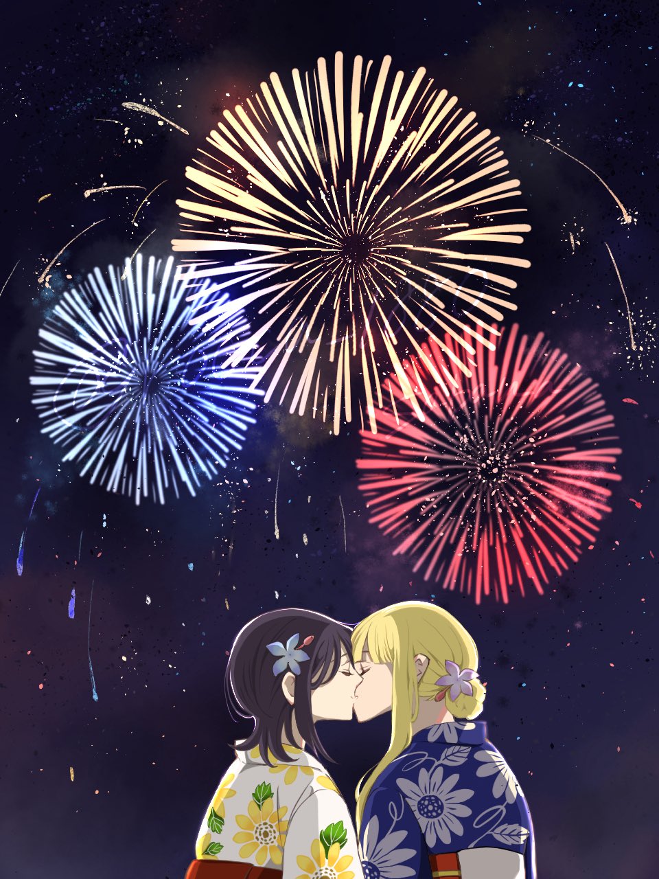 2girls aerial_fireworks blonde_hair blue_flower cho_kaguya-hime! closed_eyes commentary_request fireworks floral_print floral_print_kimono flower hair_flower hair_ornament highres japanese_clothes kaguya_(cho_kaguya-hime!) kimono kiss long_hair medium_hair multiple_girls night obi outdoors print_kimono purple_flower purple_hair purple_kimono sabana_(rocca_1880) sakayori_iroha sash white_kimono yuri