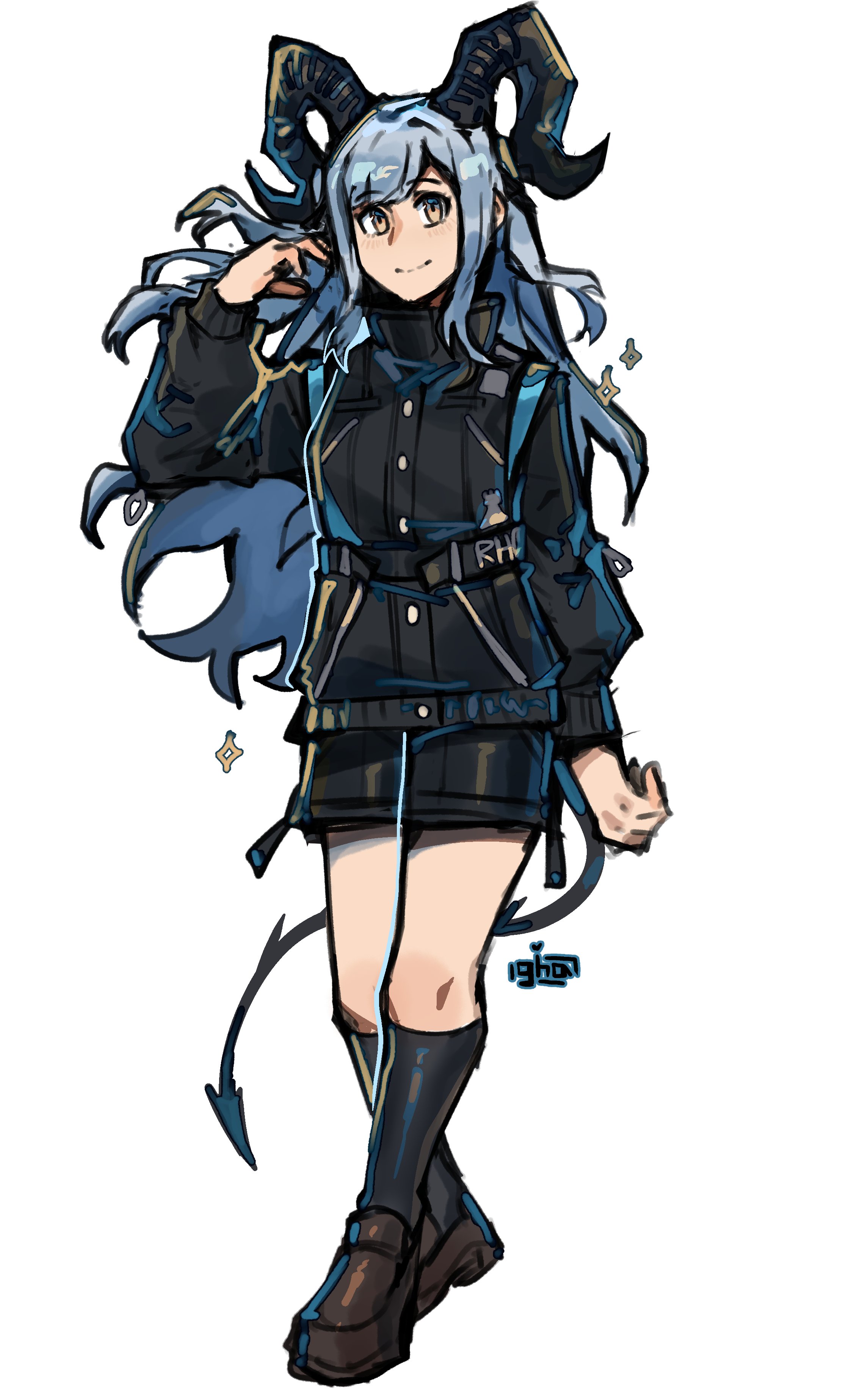 1girl absurdres arknights bang_dream! black_horns black_jacket black_shorts black_socks blue_hair brown_eyes brown_shoes closed_mouth curled_horns demon_girl demon_horns demon_tail full_body graysheartart grey_hair hand_up hashtag-only_commentary highres horns jacket kneehighs loafers long_hair long_sleeves looking_at_viewer puffy_long_sleeves puffy_sleeves shoes shorts signature simple_background smile socks solo sparkle standing tail togawa_sakiko togawa_sakiko_(sarkaz) very_long_hair white_background yellow_eyes