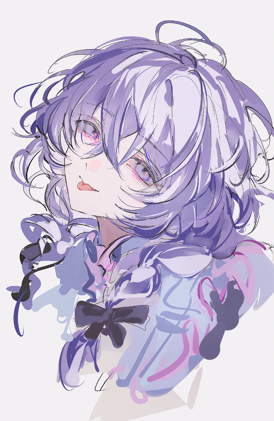 1boy androgynous black_bow bow braid bright_me_up!!_(ensemble_stars!) cropped_shoulders crossed_bangs ensemble_stars! hair_between_eyes hair_bow hanamura_fuyume highres kurayuki0404 looking_at_viewer male_focus medium_hair official_alternate_costume official_alternate_hairstyle purple_eyes purple_hair purple_shirt shirt simple_background sketch solo tongue tongue_out trap twin_braids white_background