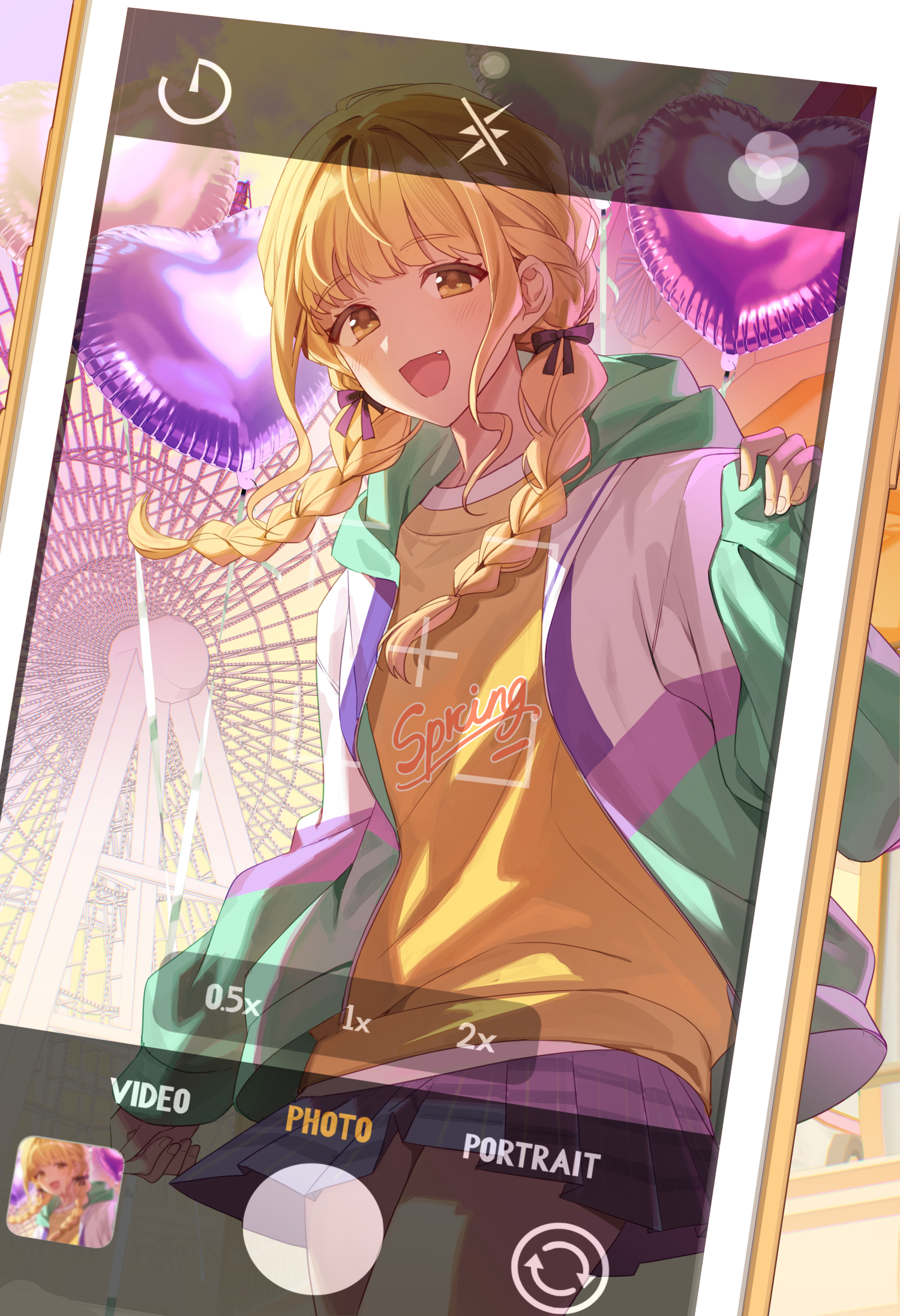 1girl balloon black_ribbon blonde_hair blue_skirt braid cellphone cellphone_photo chapuding commentary fang ferris_wheel fujita_kotone gakuen_idolmaster hair_ribbon heart_balloon highres idolmaster jacket long_hair long_sleeves multicolored_jacket outdoors phone pleated_skirt ribbon shirt skirt smartphone solo twin_braids yellow_eyes yellow_shirt